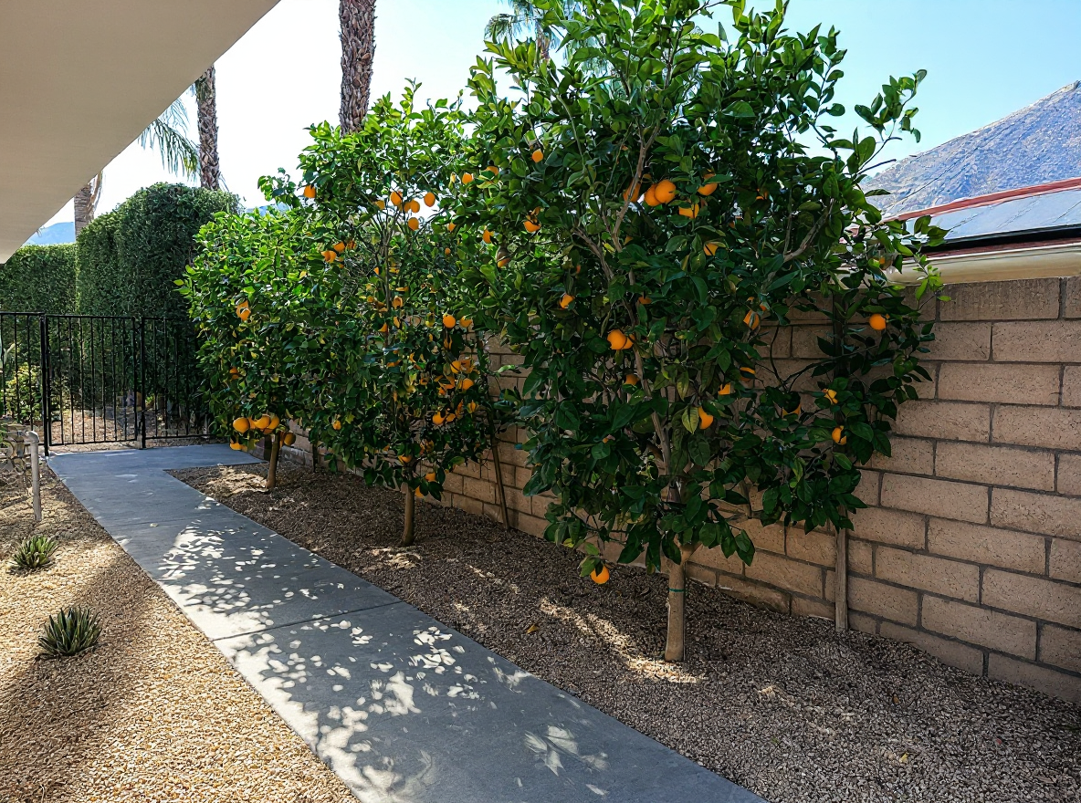 white stucco wall finish gray shingle roof modern landscaping with up lights dark window mullions and trim dark siding between upper and lower windows on right side of house sunset sky with clouds and pink and orange hues bright lights in windows darker window trim more landscape lights