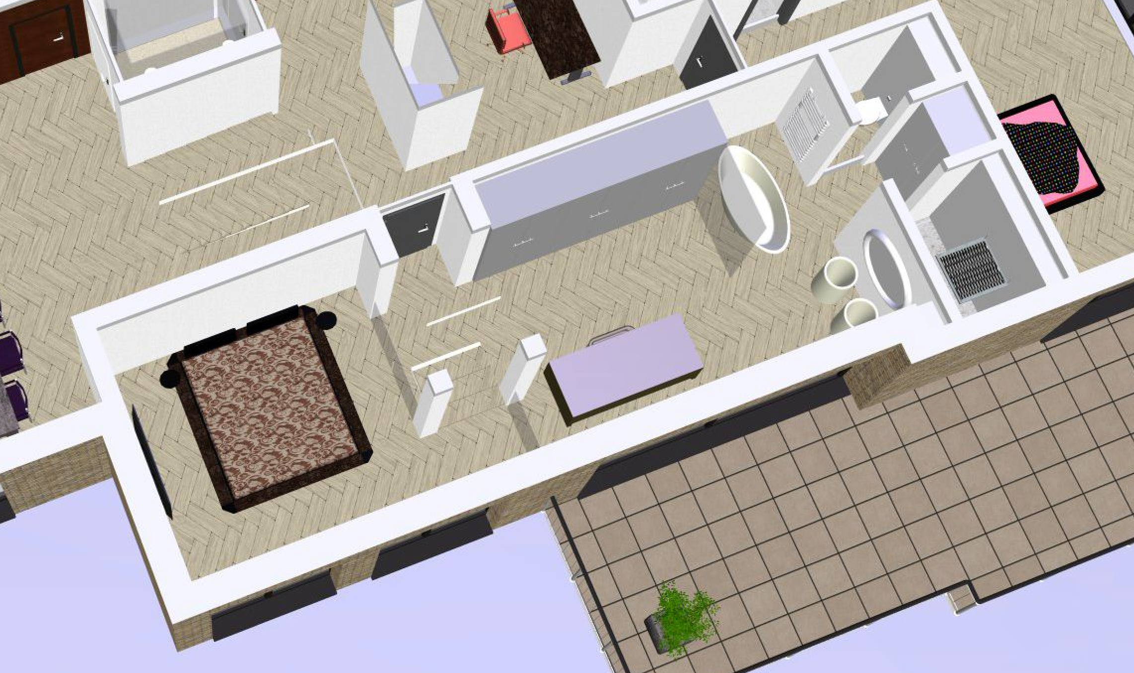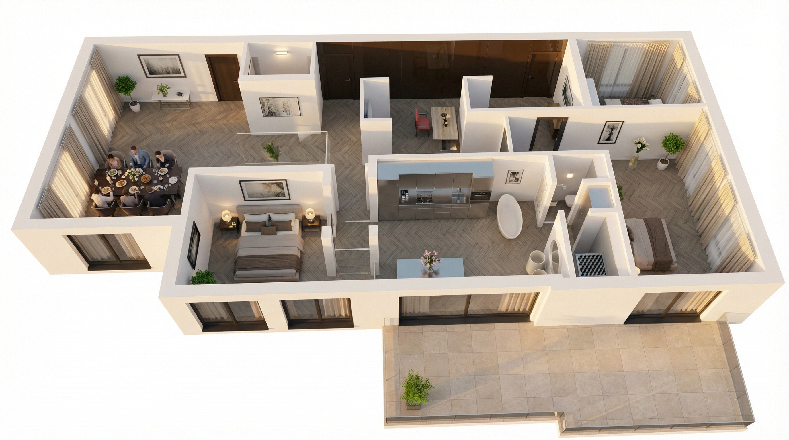 genau dieses rendering berarbeiten keine anpassungen fotorealistisches innenraum foto exakt dieselbe perspektive und kameraposition wie das hochgeladene referenzbild 100 identische raumgeometrie exakt gleiche m belanordnung innen parket eiche braungrau hell fischgrat 60 grad verlegt chevron verlegerichtung quer zum rendering leicht ge lt alle vier terrassen platten 80x80 cm hellbeige gegen ber dem esstisch ganze wand mit den zwei t ren in glas dunkelbraun opak ganze k che in edelstahl alle betten ersetzen mit designerbetten von fendi alle m bel ersetzen mit designerm bel esstisch mit clubsesseln und menschen am tisch exakt identische fensterpositionen mit gleichem ausblick durch die fenster weiches nat rliches tageslicht leicht schr g einfallende sonne durch die grossen fenster geschlossene r ume k nstlich ausleuchten sanfte realistische schatten blickrichtung ist nach westen sonnenlicht kommt von links deckenbeleuchtungen in den r umen anbringen realistische materialien echte holztexturen stoff mit leichten gebrauchsspuren hochwertige oberfl chenreflexionen kleine gr npflanzen bilder an weissen innenw nden blumen in vasen auf tischen einbauen alle fenster mit hellbeigen transparenten vorh ngen ganzer grundriss freistellen und hintergrund weiss nat rliche farbwiedergabe leicht warme farbstimmung golden hour feeling das bild muss wie eine professionelle fotografie aussehen es soll ein echtes und reales foto sein canon eos r5 35 mm festbrennweite f 2 8 hyperrealistisch dslr qualit t raw aufnahme 8k aufl sung extrem scharf perfekte tiefensch rfe professionelle architekturfotografie