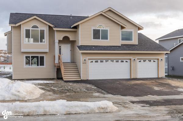 watercolor render of the home with black paint color and black trim with stone accents include trees and an alaska like environment in the background simple driveway and walkways in front of the home