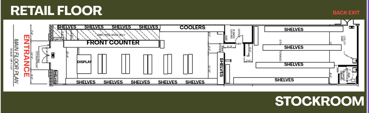 convert this floor plan into a realistic isometric 3d view of a full house show the space from an elevated angle with furniture walls and details visible liquor store use the same furniture as shows on the plan do not change the orientation of the floorplan