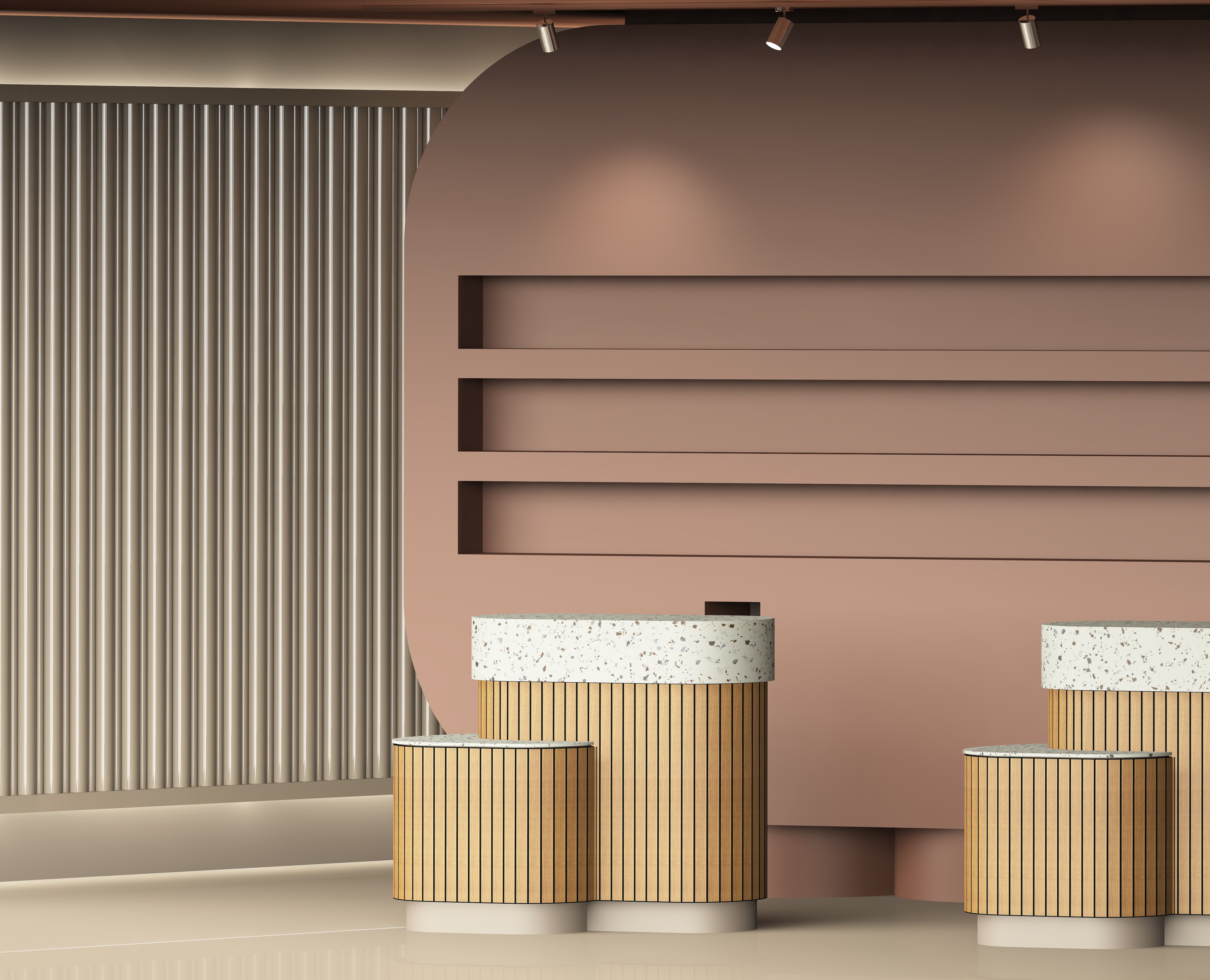 enhance the provided interior render without altering geometry proportions layout camera position or design intent preserve all architectural elements exactly as given no distortion no redesign no added objects create a bright inviting professional interior lighting scenario with a warm mediterranean atmosphere inspired by southern france harbor architecture materials surfaces keep as is only refine realism main feature wall in terracotta tone finished with a fine mineral plaster texture matte slightly irregular handcrafted appearance surrounding walls in greige toffee beige tones clearly distinct from the terracotta also with subtle mineral plaster texture ceiling slightly darker than floor warm and calm plastered surface floor in light microcement seamless matte softly reflective non glossy sales terminals with vertical solid wood slats teak like appearance natural warm brown finely detailed grain countertops and shelves in light terrazzo fine aggregate calm pattern matte finish sockels and transitions flowing seamlessly from floor material lighting concept key focus use a single consistent warm color temperature approx 2700 3000k lighting is accent oriented not uniform architectural spotlights create soft but defined light cones emphasizing wall geometry rounded edges niches and terminals main terracotta wall is rhythmically highlighted to enhance depth and texture indirect lighting subtly enhances vertical profiles and spatial layering no harsh contrasts no overexposure no cold light atmosphere mood calm warm high end professional mediterranean earthy natural tactile minimalist but not sterile focus on materiality depth light and shadow rendering quality ultra high resolution photorealistic global illumination soft shadows realistic ambient occlusion natural light falloff balanced contrast and exposure editorial quality interior visualization important constraints do not change design layout or shapes do not add or remove elements do not stylize or exaggerate only refine lighting material realism and overall atmosphere