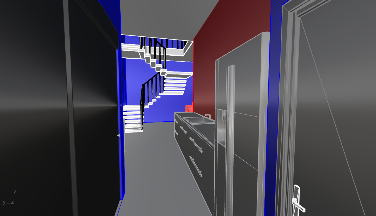 imagine ultra realistic architectural interior rendering of a two story accessory dwelling unit adu view from compact kitchen toward interior stair minimalist tropical modern architecture narrow galley kitchen with built in base cabinets and integrated appliances smooth plaster or concrete walls restrained neutral material palette compressed ceiling height at kitchen transitioning into a vertical stair void sculptural split flight stair with floating concrete treads and slender black metal railing double height space beyond kitchen vertical window and overhead opening bringing indirect daylight down into the stair strong contrast between compressed and expanded space inward and calm atmosphere soft natural daylight only no decorative lighting clean architectural detailing professional architectural visualization eye level interior perspective raw photo realism ar 4 3 style raw