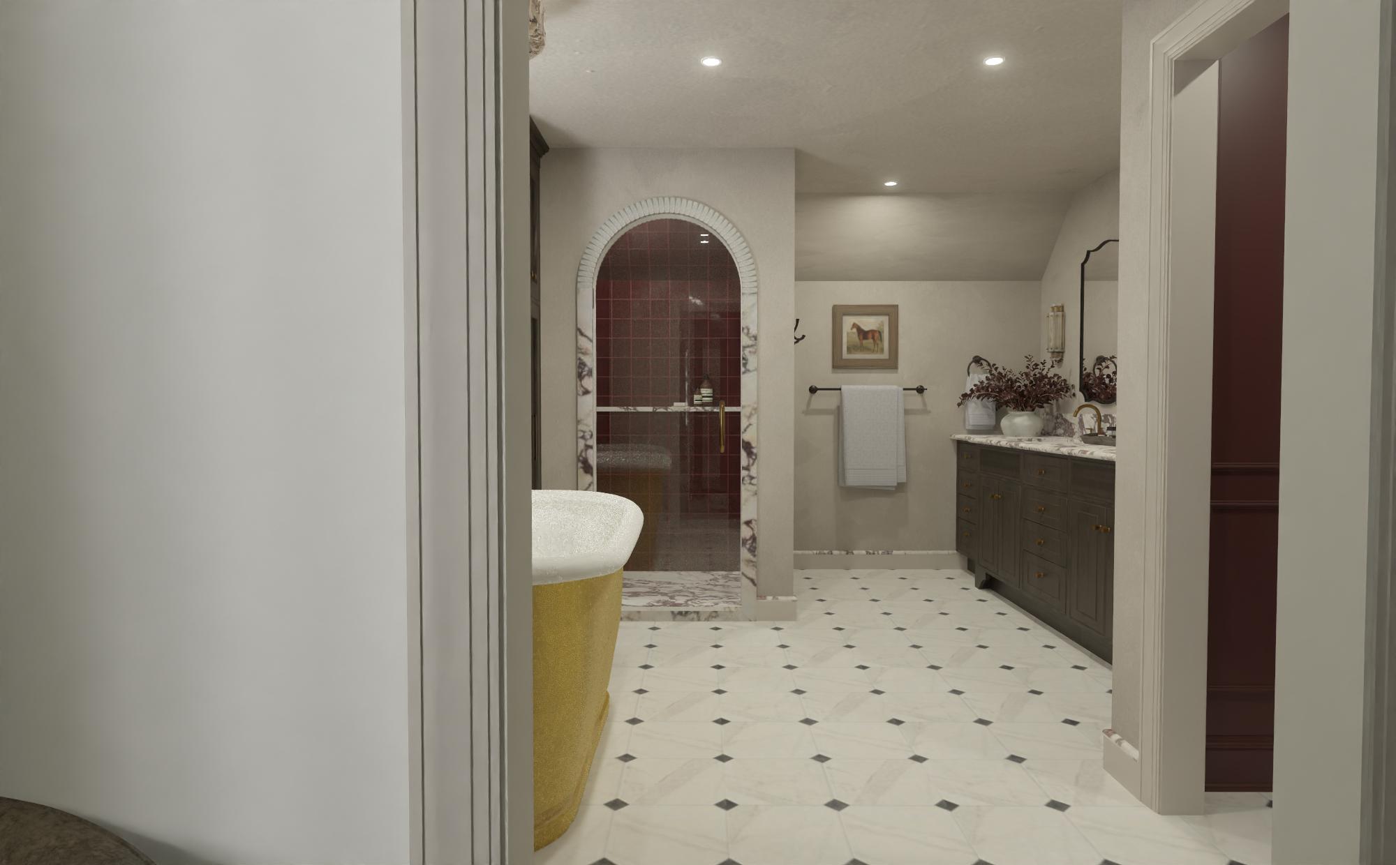 ad a subtle limewash finish to the walls keep the colour in the room on the right make the outside of the tub polished gold the inside should stay white