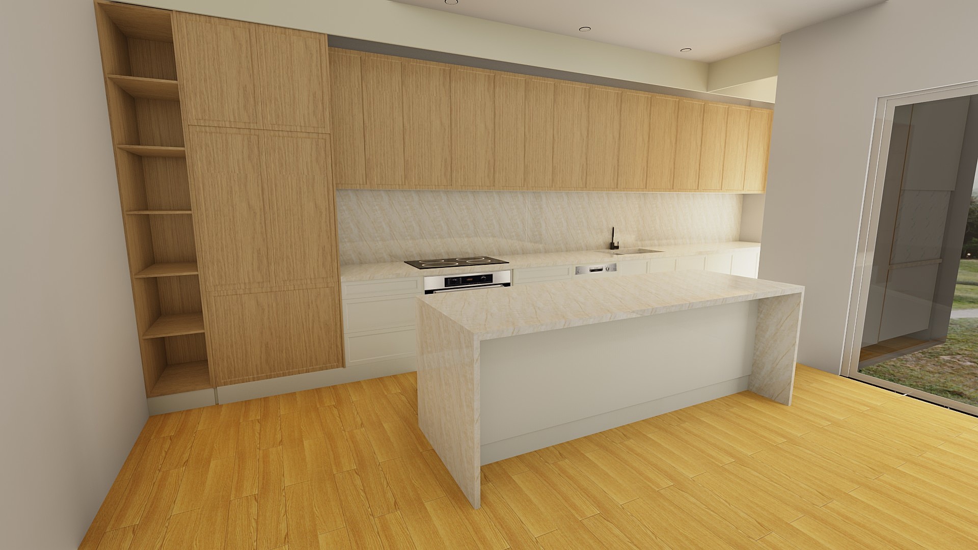 zaha hadid interior shot please make the floor woodpecker apollo the cabinet profiles polytec susses and colours gossamer smooth ecru oak and the benchtops taj mahal and recommend a different design architecture