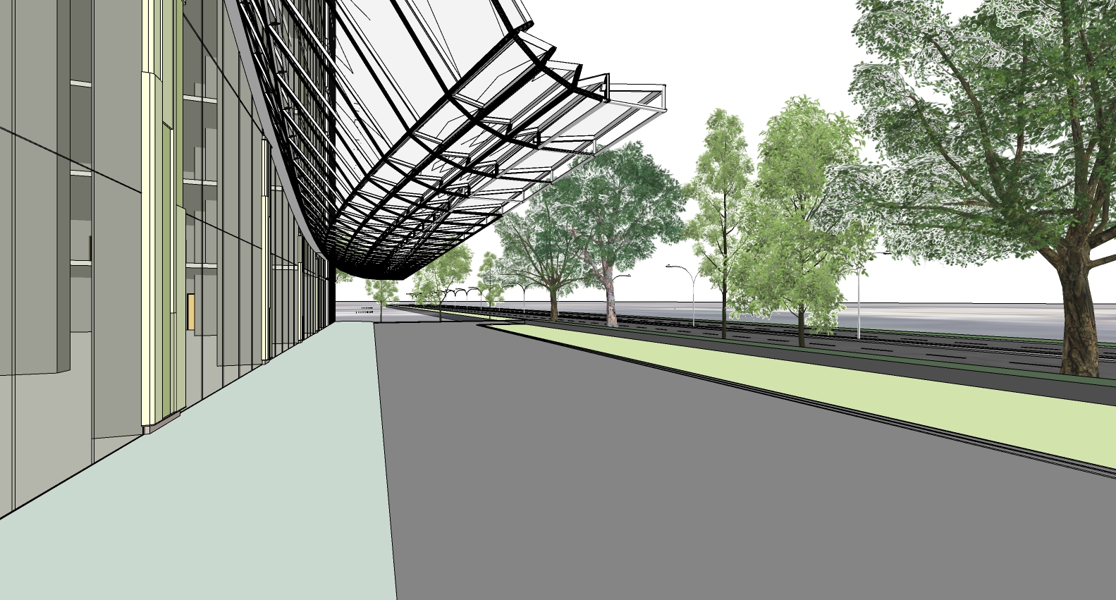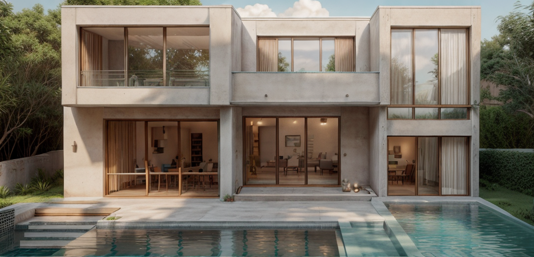 modernist exterior shot maintain geometry add blue sky hyper realistic rendered view 5k architecture