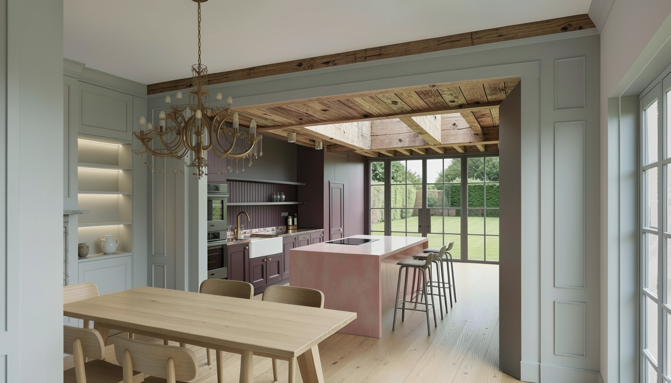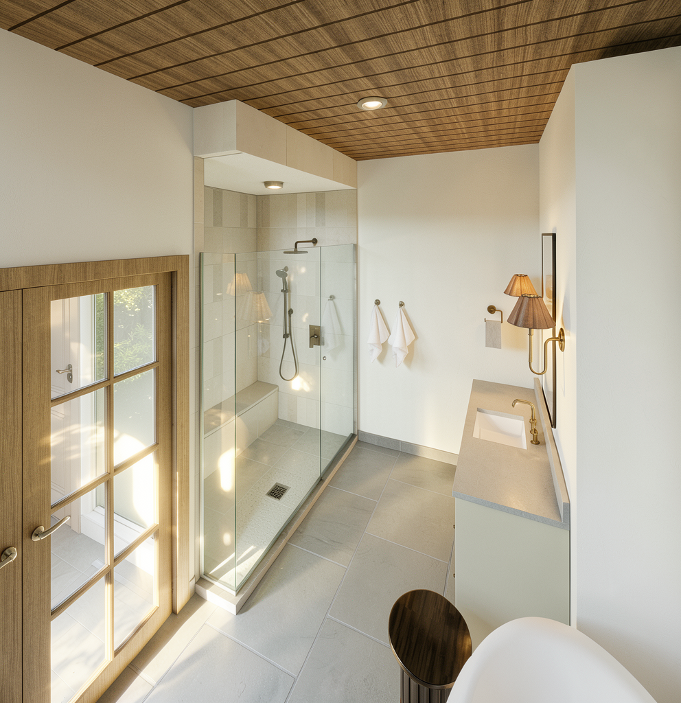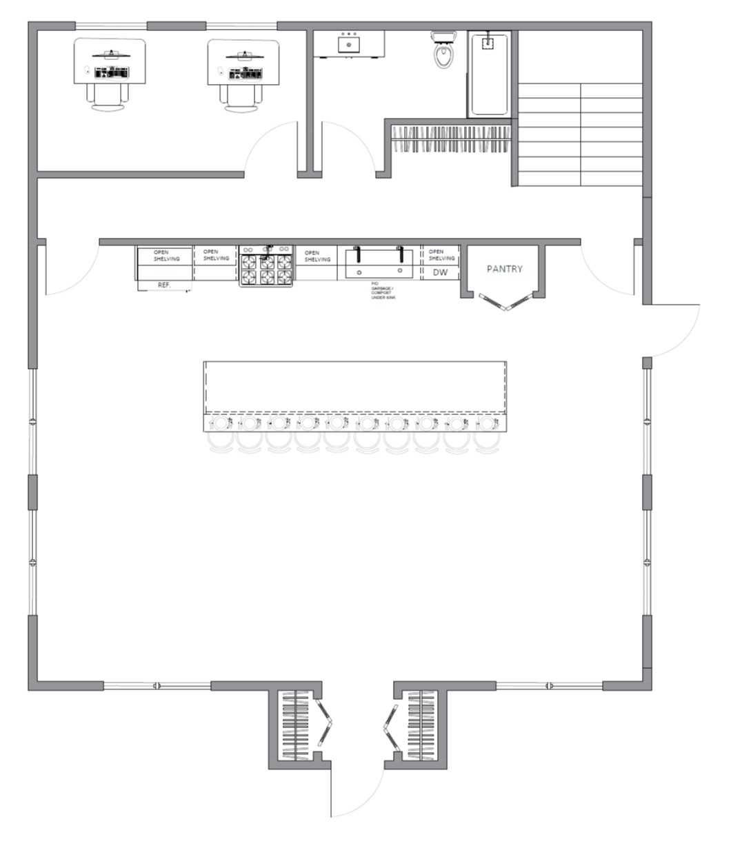 convert this floor plan into a realistic isometric 3d view of a full house show the space from an elevated angle with furniture walls and details visible modern lower level interior of a commercial live work space with a clean contemporary design add potted plants and restaurant d cor to the kitchen island while maintaining a cohesive neutral palette the flooring throughout the level is dark plank wood creating contrast against light modern walls and trim an open staircase connects the levels and features a modern open stair design with minimalist posts and horizontal cable railing creating a light and airy architectural feature add a few trees outside make exterior black cedar the area in front of the main entrance is a yoga studio add yoga mats and some yoga studio decorations use the same furniture as shows on the plan do not change the orientation of the floorplan