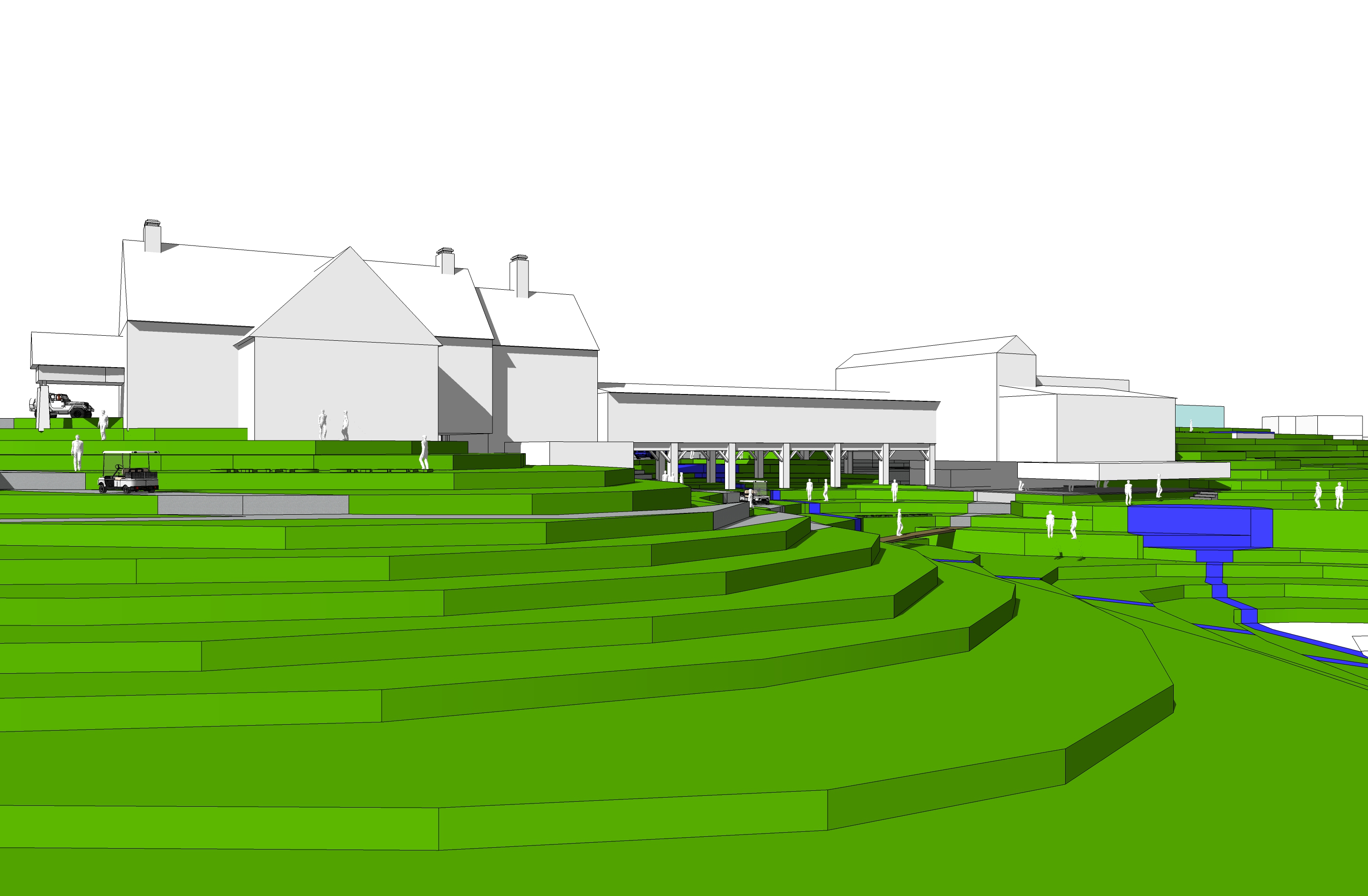 buildings set in naturally sloped hill covered bridge with large windows and water feature under old stone farmhouse with windows vertical shiplap mill house tall grass hill foreground fog trees in background