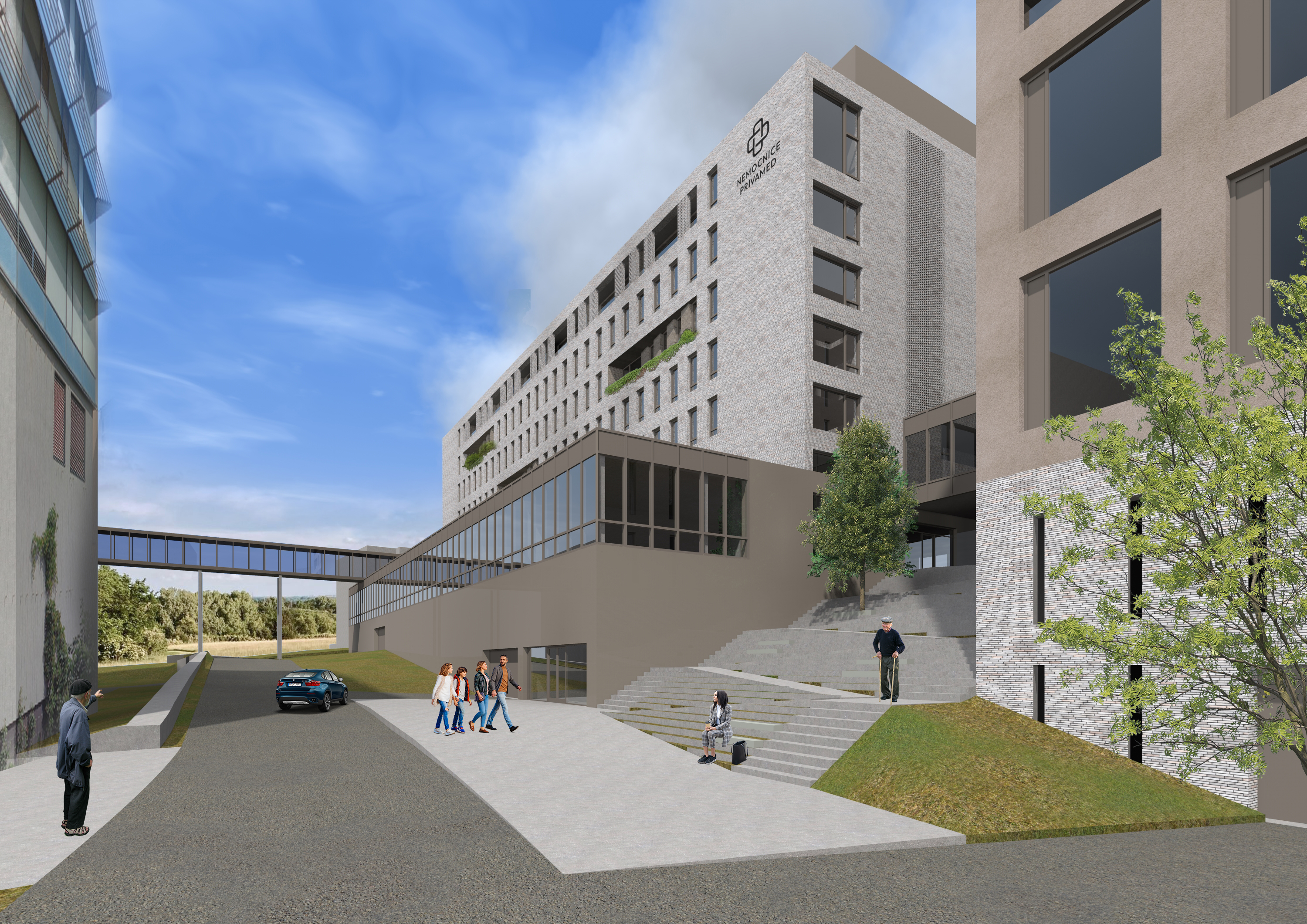 create a stunning urban scene featuring modern architecture the sky is bright blue with soft fluffy clouds the main building is a sleek light gray brick with large reflective glass windows surrounding buildings are in varying shades of light brown and beige trees are lush with green leaves and the ground is a mix of textured gray pavement and neatly trimmed grass add small groups of people casually walking dressed in contemporary attire adding life and movement the atmosphere is vibrant and inviting capturing a sunny bustling day in the city