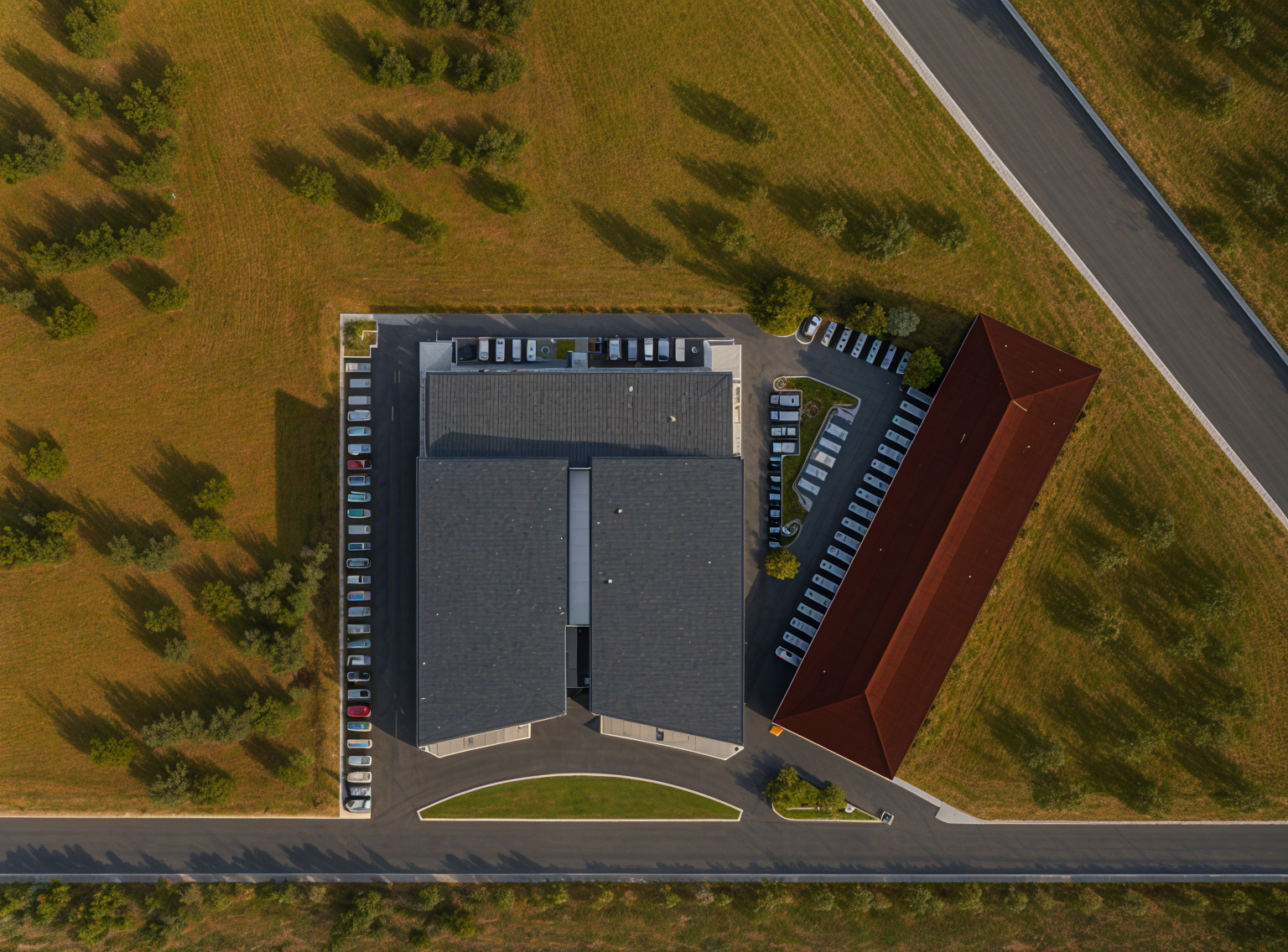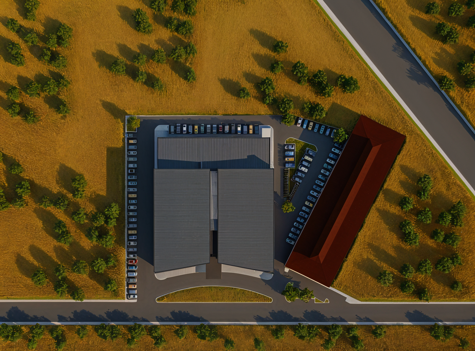modern exterior shot visualise a spiritual nature retreat in western ghats of india amidst dense vegetation and hilly terrain a communal building consisting of metal roof living and dining cafe area with farming in the foreground on a cloudy humid day architecture