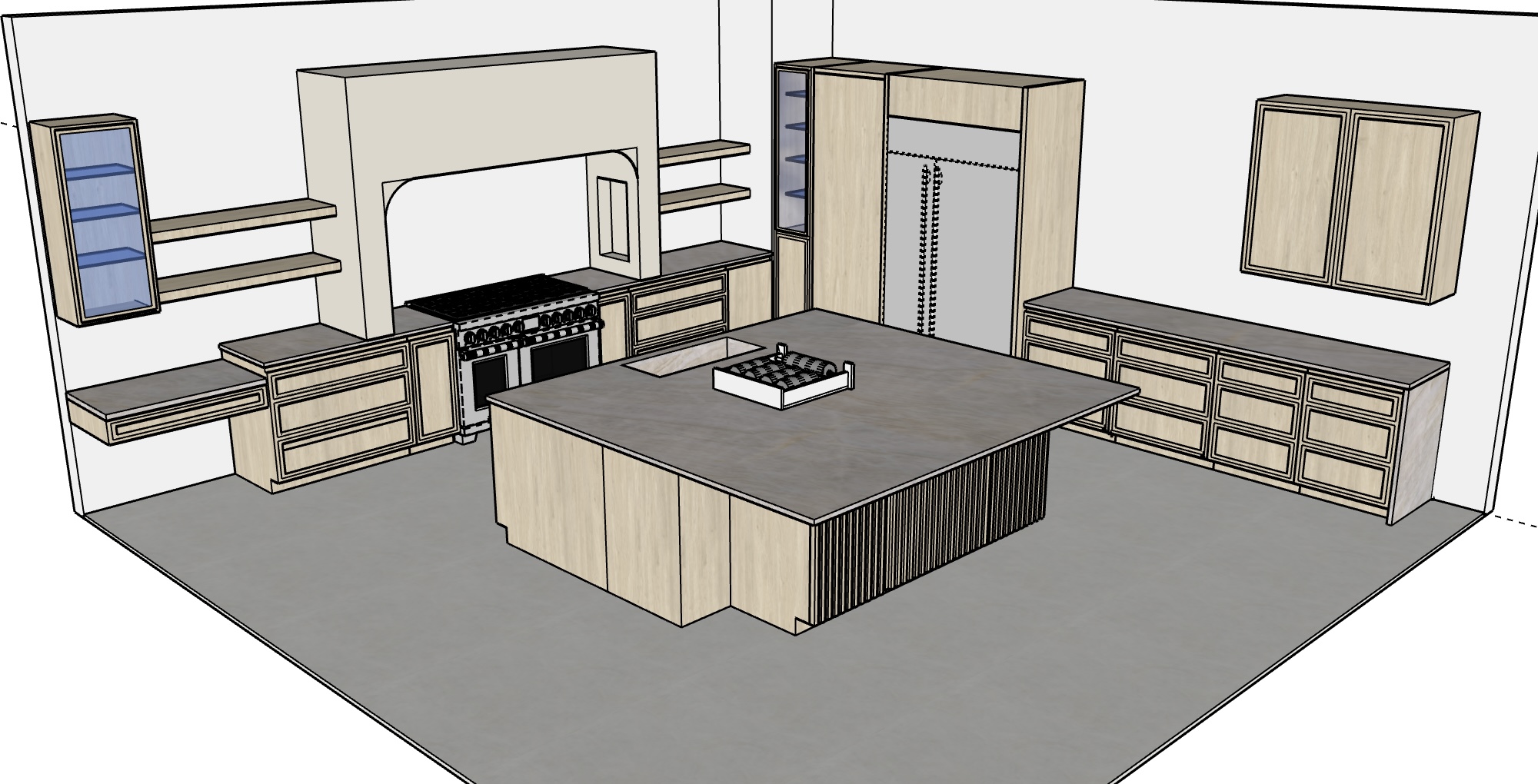 wide angle shot render a modern kitchen with light oak cabinetry and taj mahal countertop the walls should be a soft white creating an airy and open atmosphere include a polished chrome stove with black details at the center add glass cabinets with no tint to display elegant glassware illuminate the scene with warm inviting under cabinet lighting the flooring should be a smooth off white concrete 48 x48 tile giving a sophisticated contrast to the light cabinetry the overall atmosphere should be calm modern and welcoming architecture