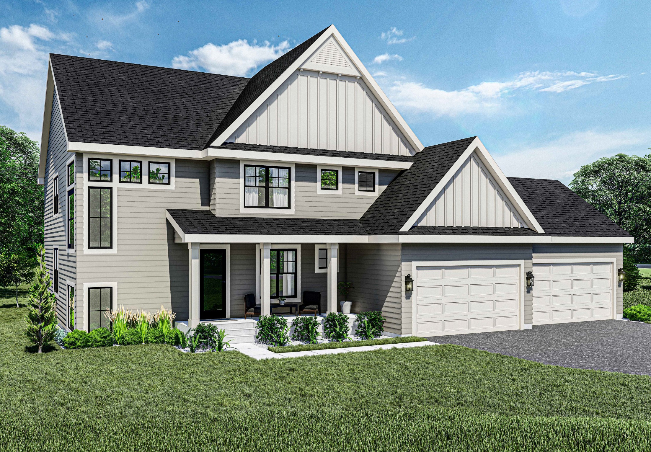 generate a high quality photorealistic render of the provided architectural elevation modern farm house white panels and reflective glass windows framed in matte black stand out elegantly a modern front door in black with windows glass at sunset the atmosphere should be light and airy with clear blue skies and soft sunlight casting soft shadows from the front the surrounding landscape should include lush green grass colorful flowering shrubs and tall deciduous heavy rear trees with autumn colored leaves architecture lights on in all rooms of the house as well as exterior output a single landscape oriented photorealistic rendering that is architecturally faithful visually balanced and color accurate to the above specifications