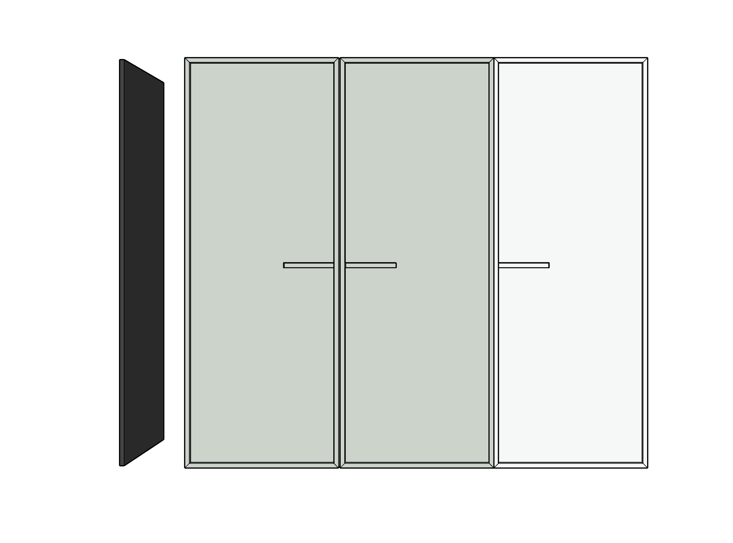 furniture on a concrete floor with a white background no decorations green and white matt finish on the wardrobes blackboard on the left