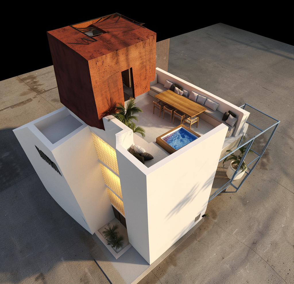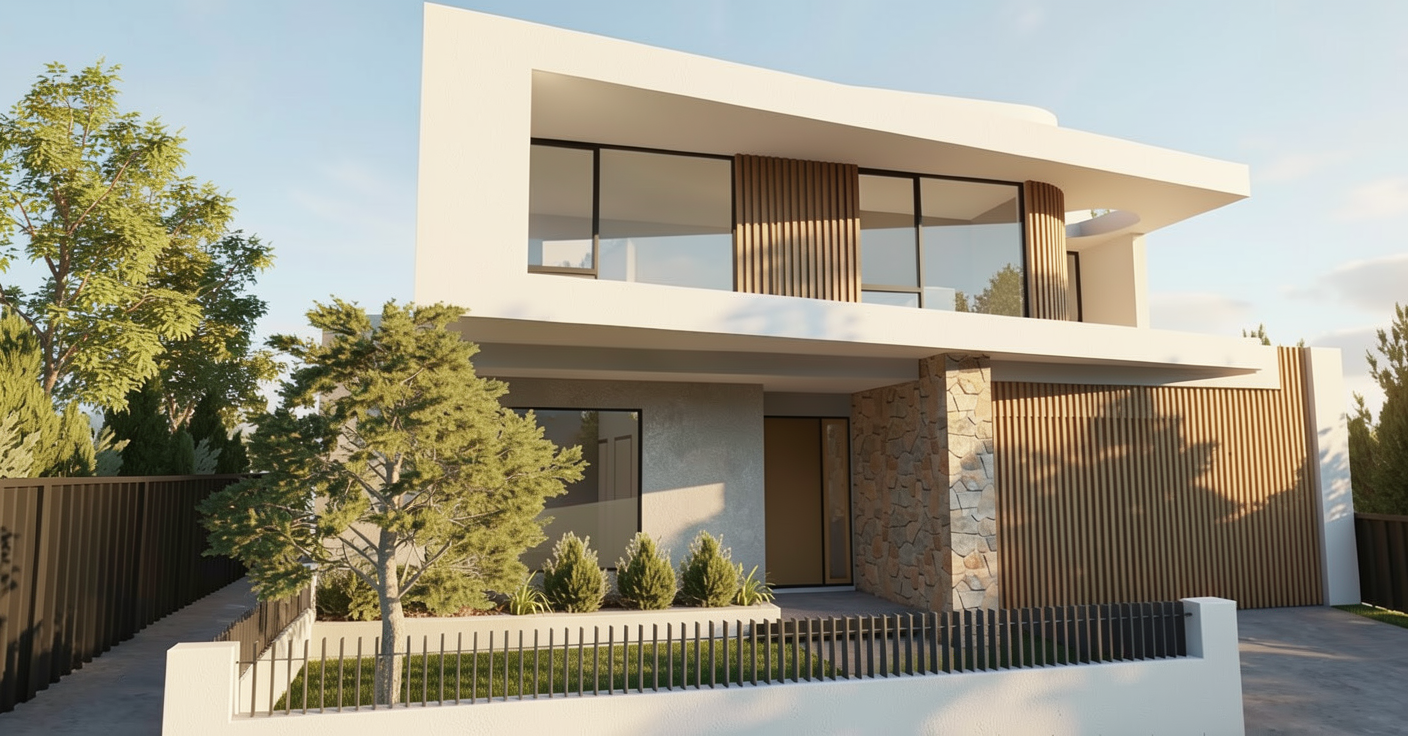 improve the visual quality of this architectural render by enhancing lighting realism shadow accuracy reflections and global illumination while strictly preserving the original architectural design do not modify geometry structure proportions materials layout or architectural elements increase photorealism through natural light behavior soft shadow transitions accurate ambient occlusion realistic reflections on glass and metal and subtle surface imperfections maintain true to life scale and material response improve sharpness depth and dynamic range for a high end professional architectural visualization look and do not redesign or alter the architecture do not change materials into different ones do not add or remove objects do not modify proportions structure or layout no stylistic reinterpretation no futuristic or fantasy elements remove the text from the left side zr b kolory ja niejsze kolory