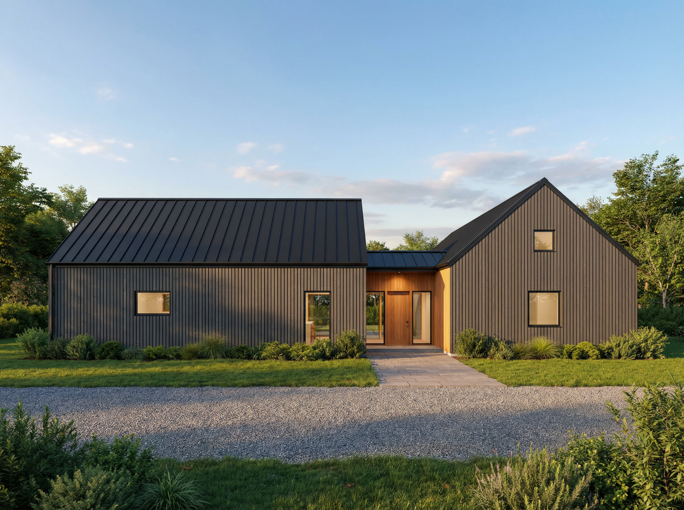 a charming modern house with a minimalist design the exterior features smooth beige walls complemented by a sleek dark gray slate metal gabled roof windows are framed in a black tone bringing contrast and sophistication surrounding this structure a serene environment bathed in soft natural light under a clear bright blue sky the atmosphere is peaceful and inviting evoking a sense of tranquility
