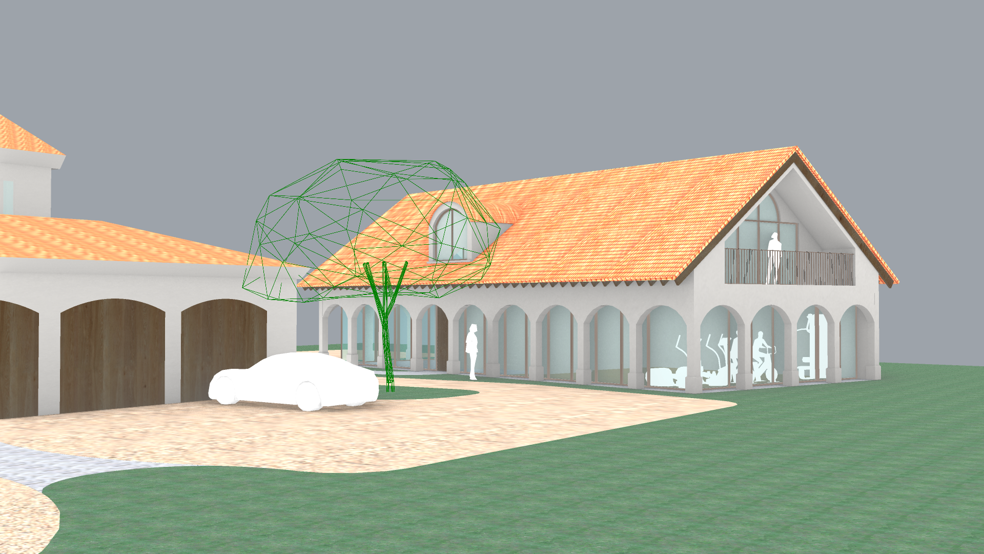 render a photorealistic 3d perspective of this house in a los angeles ca reference the current material style just enhance them spanish tile roof cream plaster keep model geometry the same windows doors roof walls garage door pea gravel driveway make a lush mediterranean vegitation turn wire frame tree into a real looking tree do not change the view only enhance the current materials and make the landscape nicer vegetation detailed textures in glass reflections and a vibrant clear sky with light atmospheric depth render in hyper realistic architectural visualization quality 8k resolution