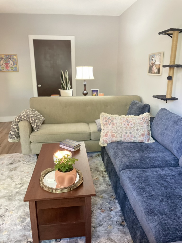 match the beige couch fabric to the blue couch