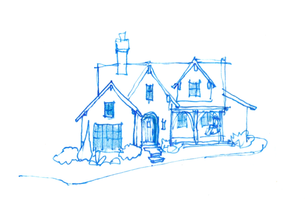 stone cottage with slate roof and curved timbers on a deep porch