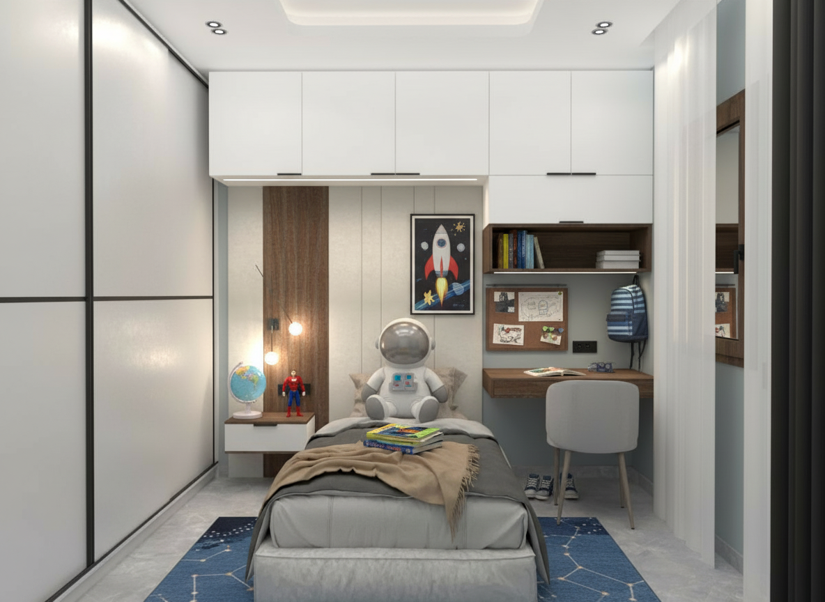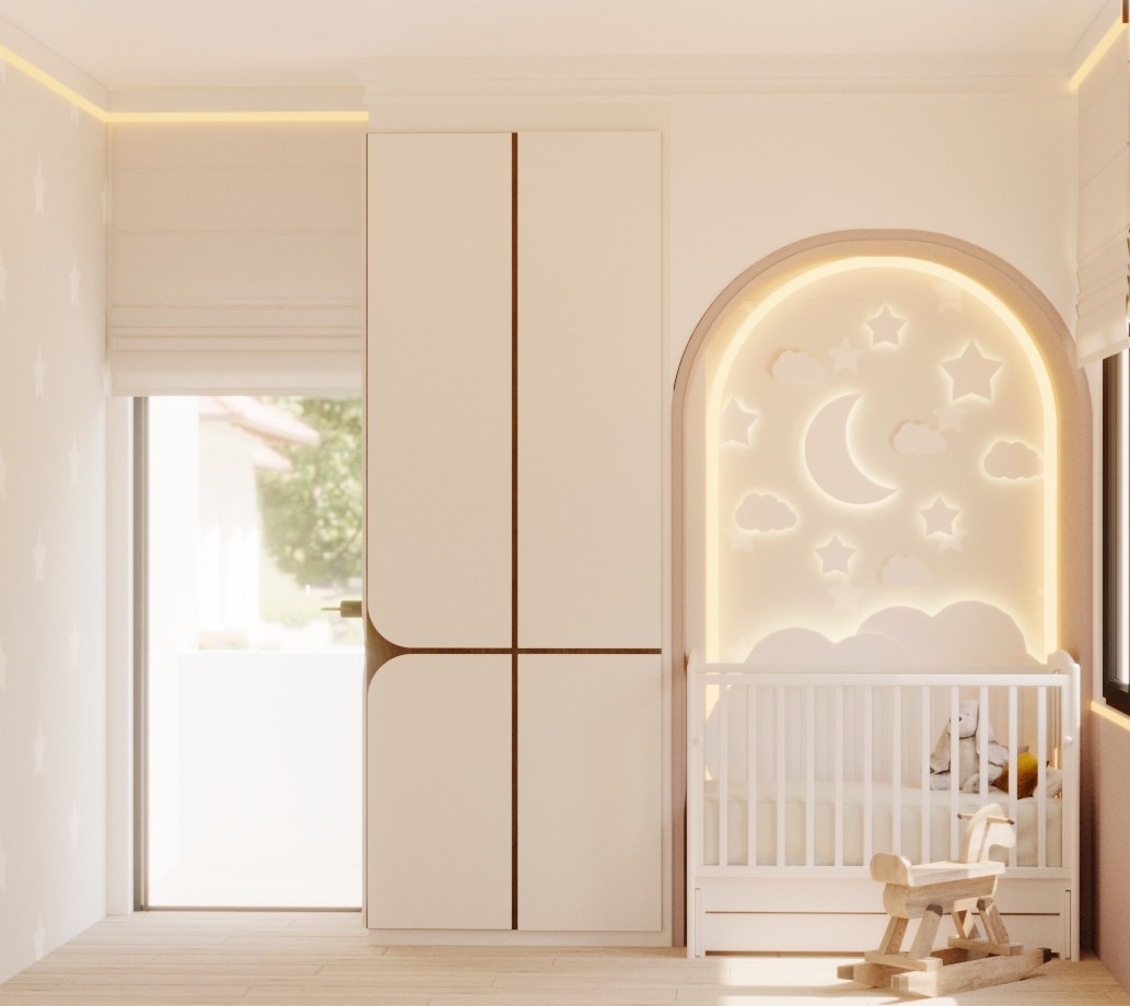 render a serene and cozy modern nursery the walls are a soft off white with delicate star patterns a minimalist white wardrobe stands with clean lines to the right a white crib is set against a feature wall with an arch the arch is adorned with glowing stars clouds and a crescent moon all softly illuminated in warm yellow tones a small wooden rocking horse in light natural wood color rests in front of the crib large windows let in abundant natural light adding to the bright and airy atmosphere the room s ambiance is calm infused with a gentle dreamy warmth