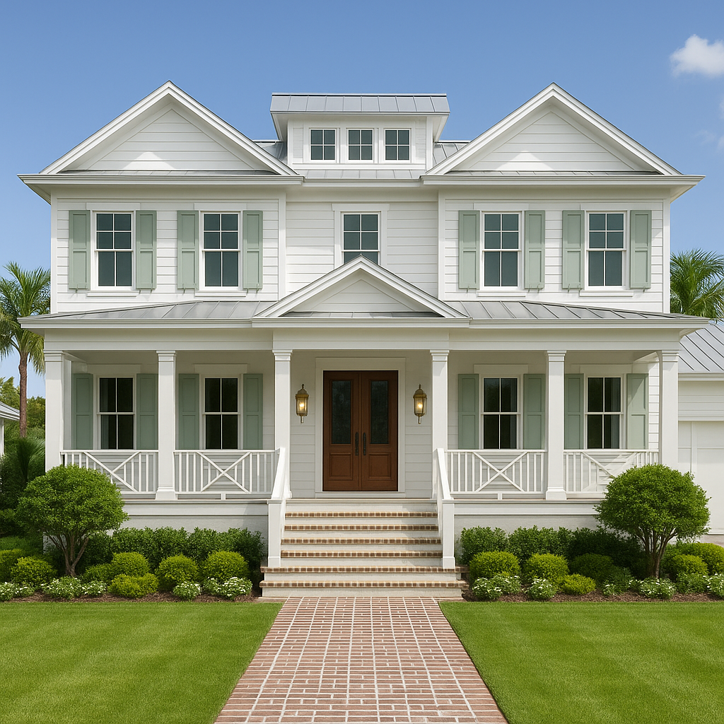 use the photo as somewhat of a style idea create a coastal symmetrical 2 story house roughly 2800 sf paint the body sw alabaster and trim sw pure white silver metal roof brass details louvered shutters on all windows in a pale blue color natural wood front door with sidelights and a transom add a two car garage on the left side attached to the house but to the side of the house total width of the structure 60