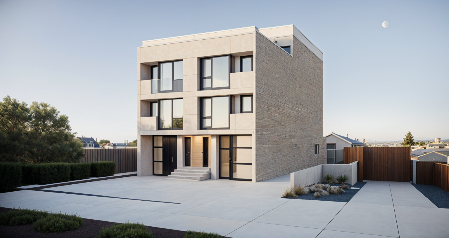 contemporary exterior shot facade made of beige stones black window frames crystal clear balconies guards locate project in a street architecture