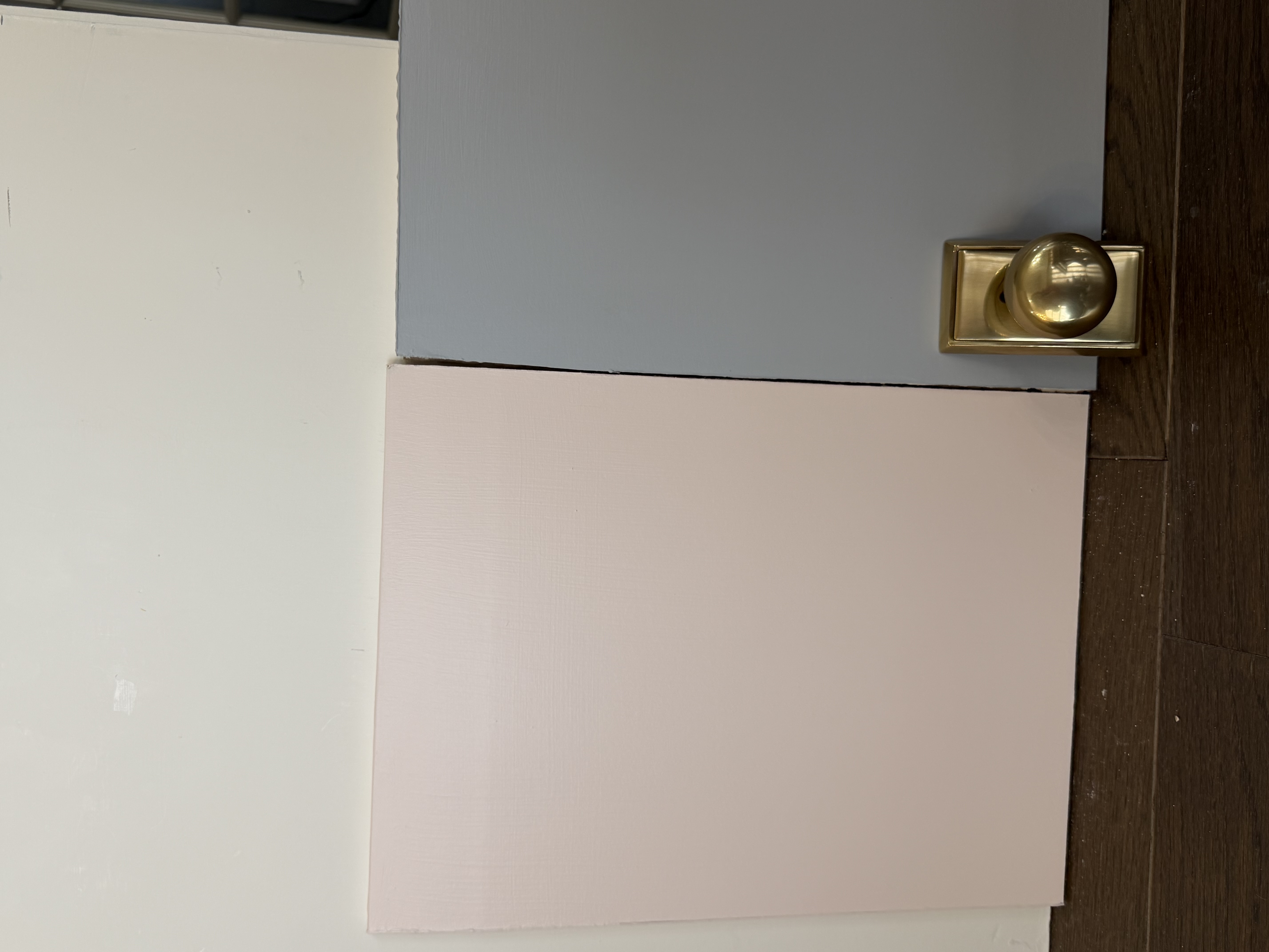 show me a teen girls bedroom with the color palette light pink walls alabaster ceiling and trim blue gray doors