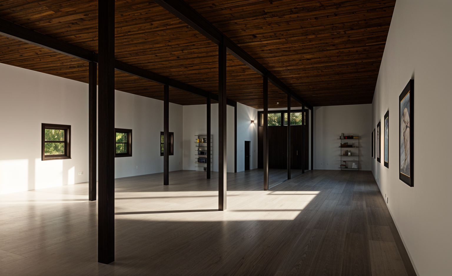a modern ranch style structure with the following features 1 medium gray asphalt shingles 2 40 high river rock wainscot all along the front base of the house 3 the existing large window openings one located in the middle of the elevation and the two on the right hand side of the elevation are a pair of white single hung windows with divided light top and bottom windows 4 black shutters on the sides of each window 5 white vertical board batten siding from the top of the stone up to the roof overhang 6 the existing front door is aligned in the same plane as the front windows to the left the door panel is black and has a 9 section divided light window in the top half of the door 7 the glazing to the right side of the garage is a pair of 36 wide white arcadia patio doors with divided lights 8 the 40 high river rock wainscot wall will extend to the right from the garage paster the arcadia patio doors to enclose a new courtyard 9 courtyard wall extending 16 to the right side of the garage 10 the sectional garage doors will be black with a 3 long x 6 window on the right end of each panel 11 starting at the right front corner of the garage extend a river rock courtyard wall to the right past the patio doors 12 add divide light to the lower two windows on the right 13 there is only one existing chimney adjacent to the garage will have river rock that matches the house wainscot the rendering should be specific to my instructions only no alternate walls or details allowed river rock is equal to genstone stone veneer