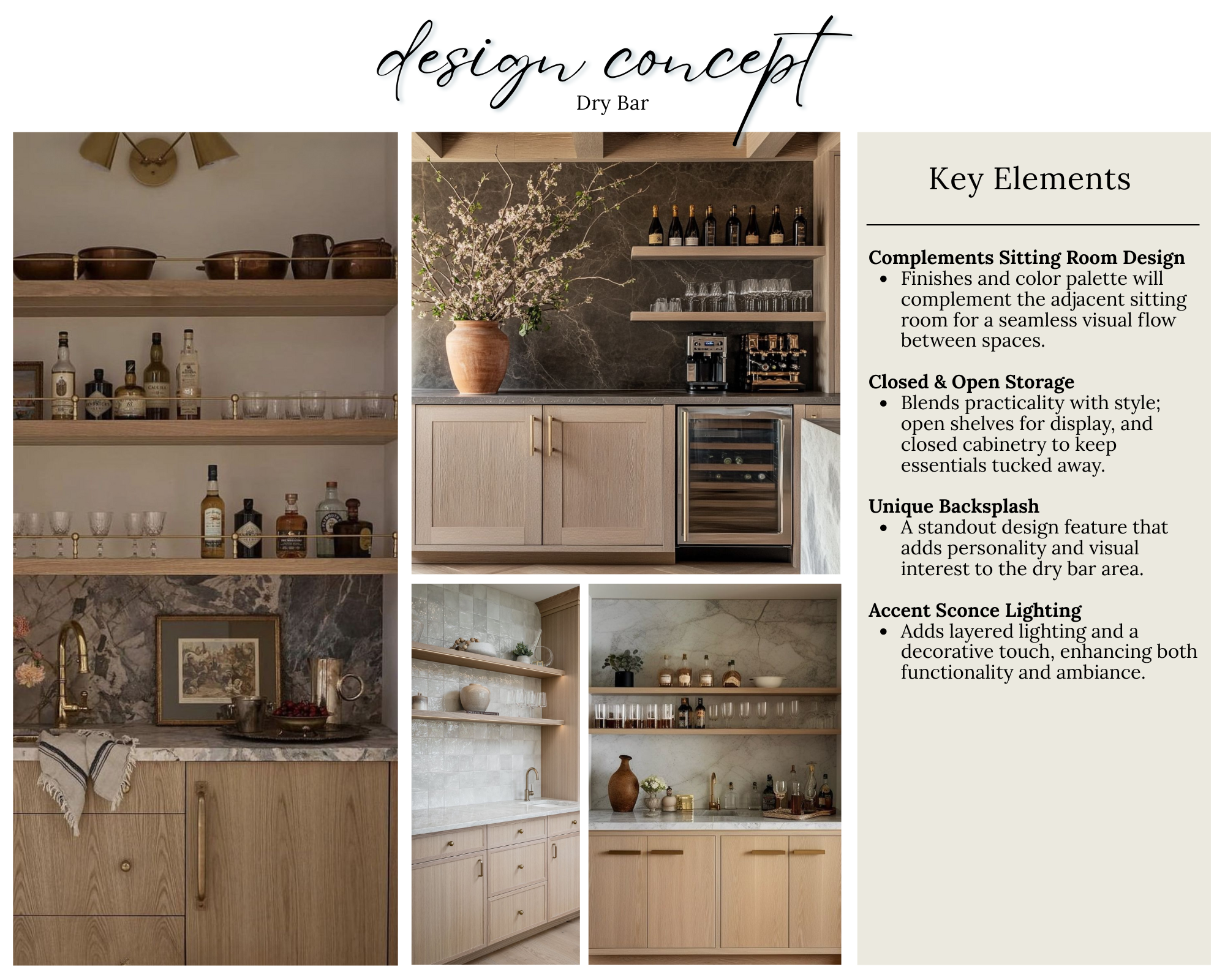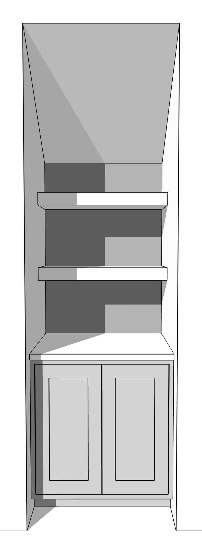 exterior shot a straight forward view of a dry bar with a base cabinet and open shelving above ceiling is sloped from front to back countertops and backsplash are the same stone material
