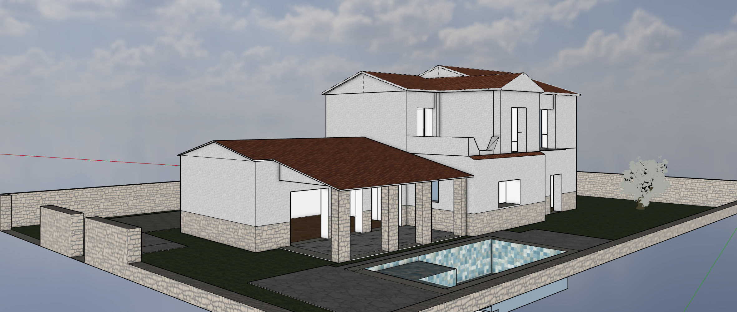 photorealistic architectural render of a mediterranean villa located in reisdere e me izmir turkey overlooking the aegean sea the property sits on a 722 square meter rectangular plot measuring approximately 31 meters wide by 23 meters deep strictly maintain these proportions the villa consists of two separate building masses a single story high ceiling kitchen and service block on the south side and a two story main living block to the north northwest facing the sea view and adjacent public park between the two masses there is an open colonnaded veranda with stone columns and terracotta tile roof creating a shaded outdoor dining and living area exterior walls are whitewashed render with natural limestone base details and stone column accents roof is traditional hip style with aged terracotta clay tiles maximum 33 percent slope on the north northwest side of the plot there is a rectangular swimming pool measuring 4 meters wide by 9 meters long with wide entry steps spanning the full width on one short end travertine coping and overflow channel on three sides crystal clear turquoise water the pool is oriented parallel to the building masses facing the park and sea view surrounding the pool there are teak sun loungers on travertine pool deck the boundary wall on the south street side is low whitewashed render while the east and west boundary walls are taller for privacy covered in red and magenta bougainvillea climbing plants garden features mature olive trees cypress trees rosemary and lavender ground cover terracotta pots with seasonal flowers south facing entrance side has a semi underground garage access the overall plot maintains strict setbacks 7 meters from south street 5 meters from east and west boundaries 3 meters from north park boundary late afternoon golden hour lighting sun coming from the west soft warm shadows clear blue aegean sky with distant islands visible on the horizon photorealistic architectural photography drone aerial perspective from the southwest showing both building masses and the pool ultra detailed high dynamic range