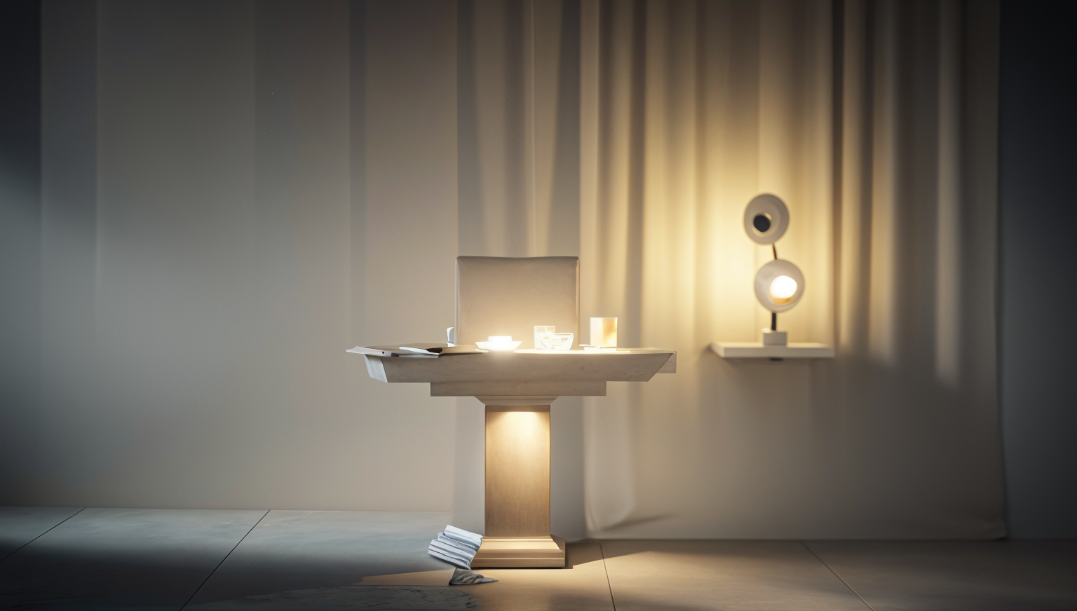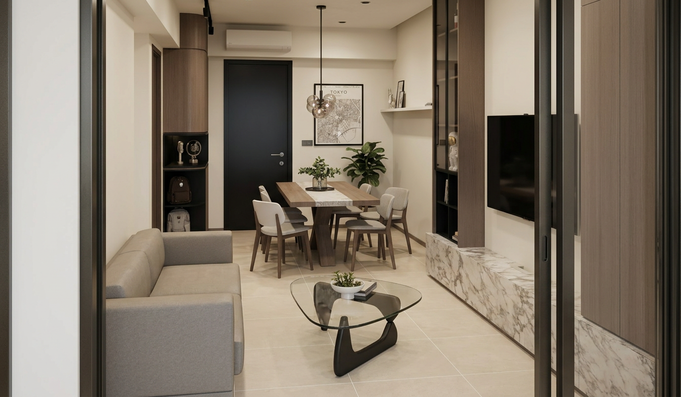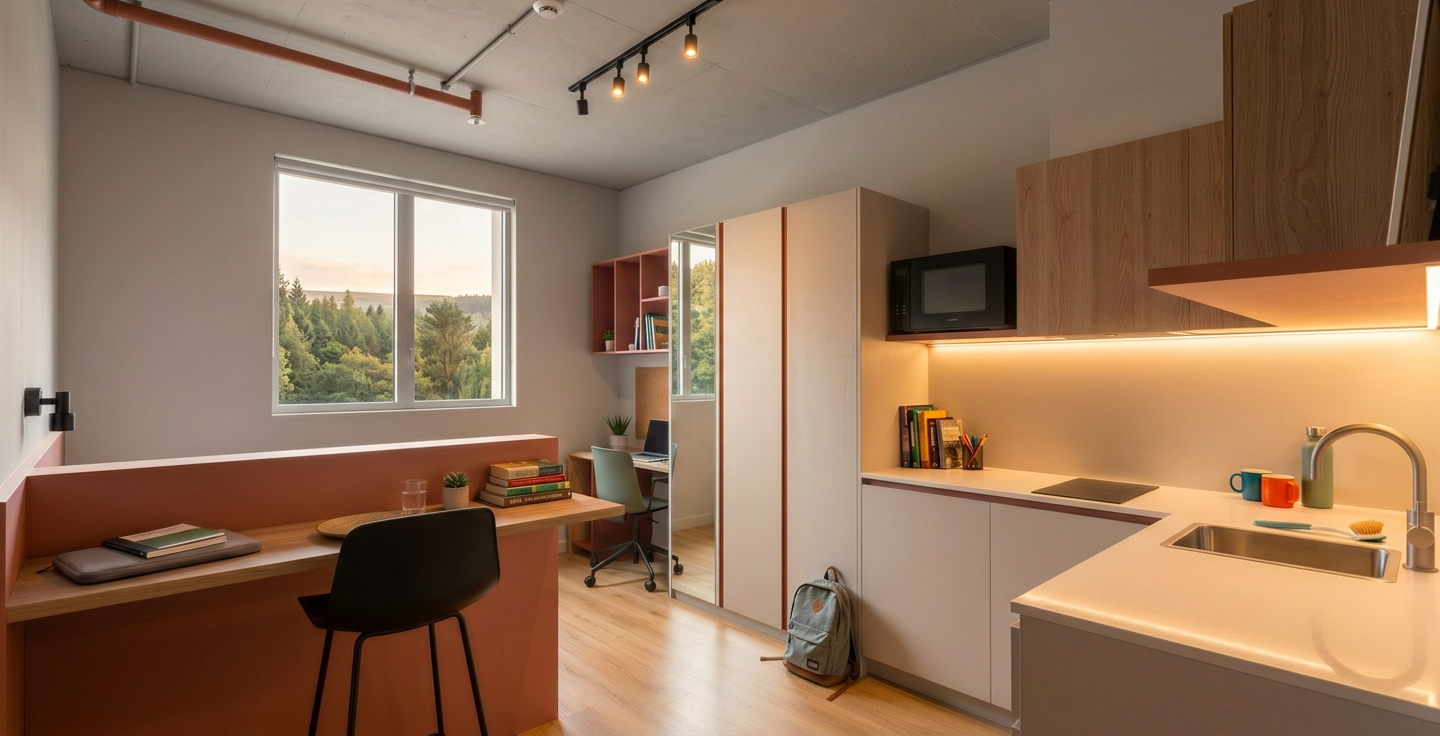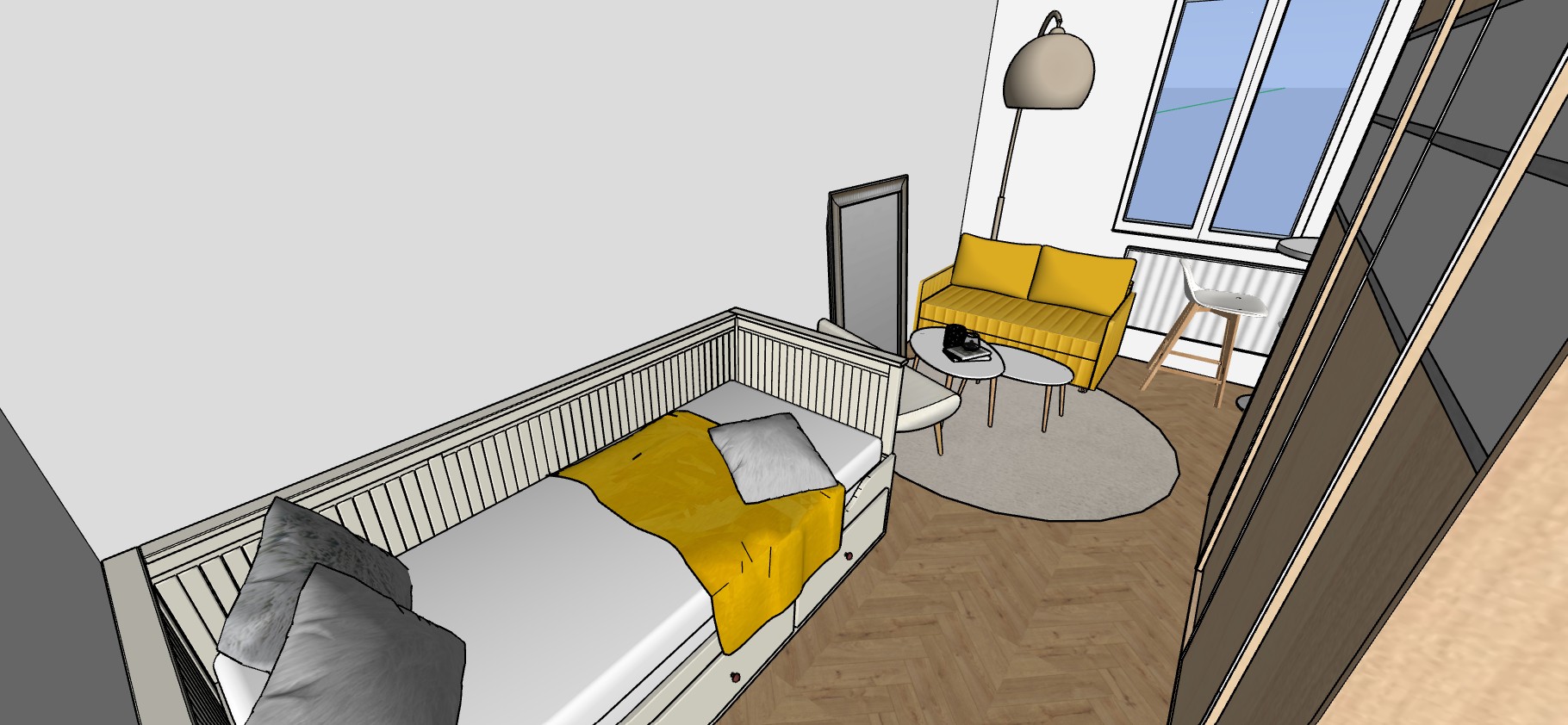 strictly preserve geometry furniture placement and proportions from the input image photorealistic render of a compact scandinavian style studio apartment interior viewed diagonally from near a floor to ceiling wardrobe divider toward the window seating area the composition shows the sleeping zone in the foreground and the living corner near the window the floor is light natural oak parquet laid in a herringbone pattern adding warmth and texture walls are smooth matte off white creating a bright minimalist atmosphere sleeping area on the left side of the room stands a white wooden daybed with a vertical slat backrest functioning as both sofa and bed the bedding is white with soft white pillows and a mustard yellow fluffy throw blanket draped casually across the mattress the bed base includes integrated storage drawers lounge area at the center of the room is a small lounge arrangement placed on a round light beige fabric rug the seating consists of a mustard yellow two seat sofa with vertical channel tufting a light cream upholstered lounge chair between the seats are two nested oval coffee tables with thin wooden legs and white tabletops styled with a small decorative tray and objects next to the sofa stands a tall arc floor lamp with a curved golden arm and dome shade extending above the seating area behind the seating area leaning against the wall is a large rectangular floor mirror with a thin silver grey frame window and dining corner the far wall contains large windows allowing soft natural daylight to enter the room with a white radiator positioned below the window near the window stands a small round dining table with a white tabletop and a single grey silver pedestal base paired with a white molded chair with wooden legs exterior view visible through the windows is a large green park with mature tall trees and dense foliage the apartment is located on the first floor so the tree canopies and park landscape appear close to the windows providing a calm natural view and soft diffused daylight entering the interior storage divider on the right side of the frame stands a large floor to ceiling wardrobe divider with light wood panels framed by thin grey lines and white accent bands forming a modern geometric panel pattern lighting lighting is soft natural daylight from the park outside combined with gentle ambient interior light creating a cozy airy scandinavian atmosphere rendering style photorealistic architectural interior visualization global illumination soft daylight ray traced reflections realistic fabric and wood textures interior photography style 35mm lens ultra detailed materials high dynamic range lighting