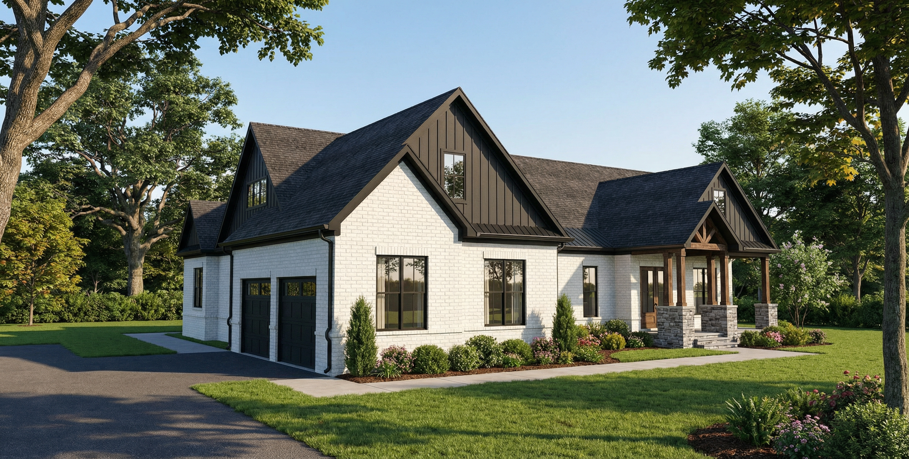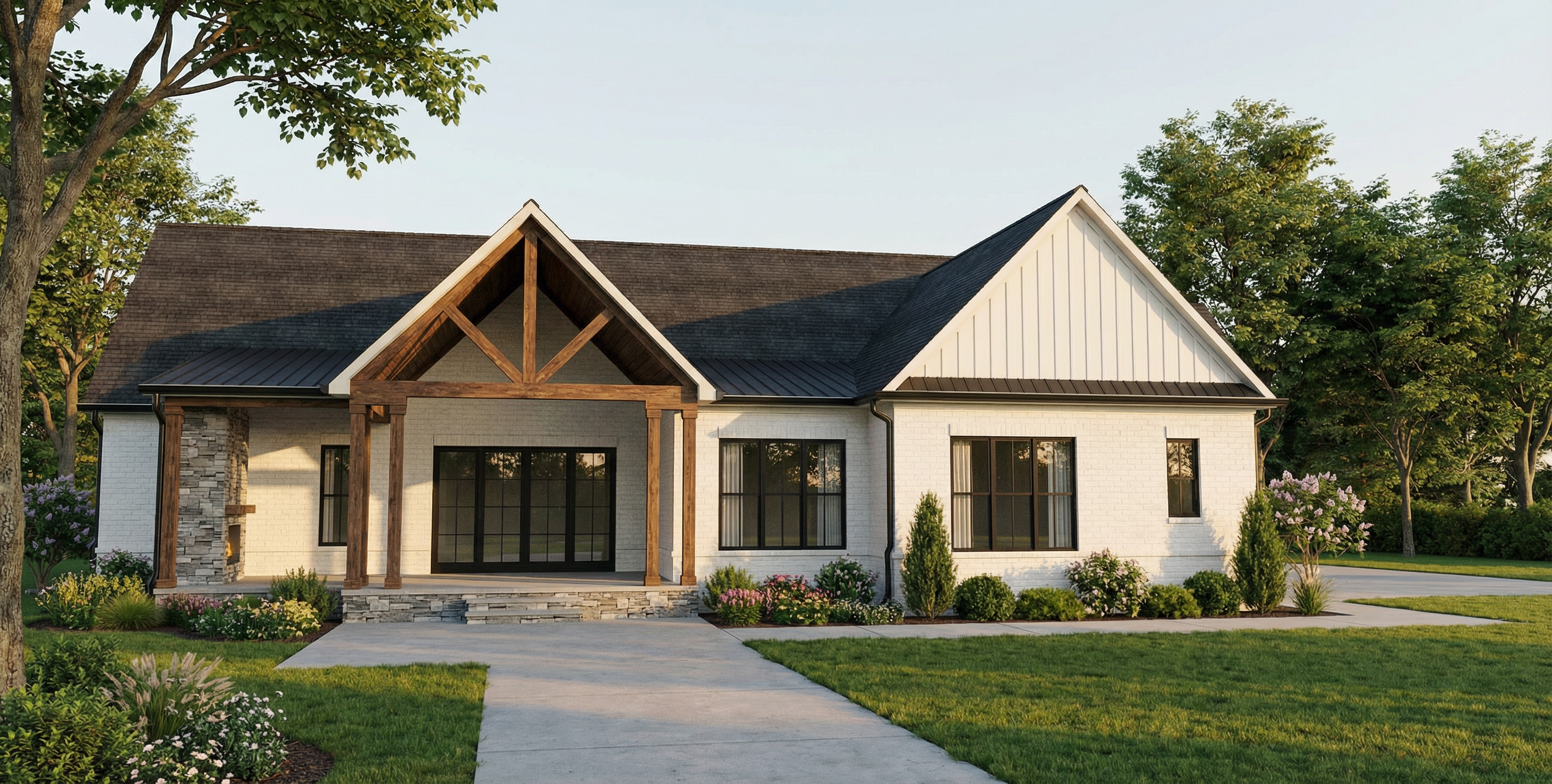 add clumps or groupings of california native plants and flowers to the yard areas with grass in between enhance the waterfall effect at the infinity edge of the swimming pool along the full length of the pool add a 2025 model vw buzz parked in the driveway on the left side make the entire driveway surface grasscrete with an asphalt road at the bottom of it with a concrete drainage trough at the bottom of the driveway add some random weeds in the grasscrete and tire tracks from cars add 3 children playing with a soccer ball on the lawn above the garage add people around the pool and swimming in the pool add one man and one woman walking up the stairs on the right side of the garage add groupings of bushes and trees to the adjacent landscape like the area around malibu lake with wild grasses in between add a man and a woman looking out from the center of the balcony at the upper level of the house enhance roadway at the upper level of the view to make it look more realistic make it one lane wide partially obscure it with bushes and trees open up the right side garage door and add an orange colored 1972 porsche 911 parked halfway inside the garage add 2 men on the driveway talking to each other with a medium sized dog sitting next to them add a small modest sized ranch style modern home with a low pitched metal roof on the adjacent parcel on the far left side of the view and partially obscure it with trees and plants and a little fog the planter along the outer edge of the garage walls keep the type of grass that is already in the view add a man and woman sitting facing the fire pit on the right sofa add some weathering effect to the 6 wide board formed concrete material of the garage walls and other retaining walls add a fog effect to the right side of the view on the adjacent parcel use the original image vertical 4 wood siding as a reference and enhance the look of the material keep the lawn area at the pool level and the two trees from the source image at the right side original image the house has a dark gray standing seam metal roof add some light inside the house add a pickup truckdriving on the road at the top of the view