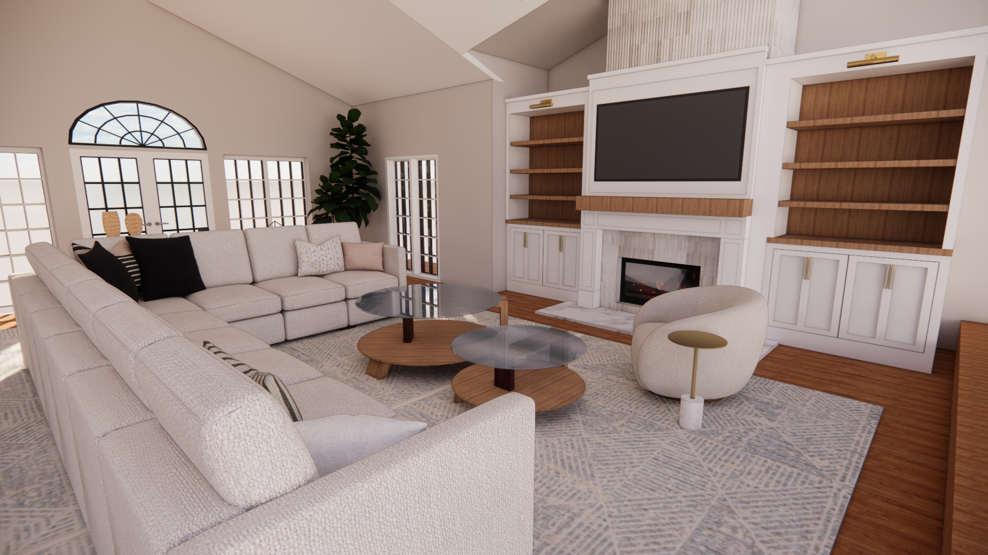 keep everything same and add angled dark wood beams on the angled ceiling