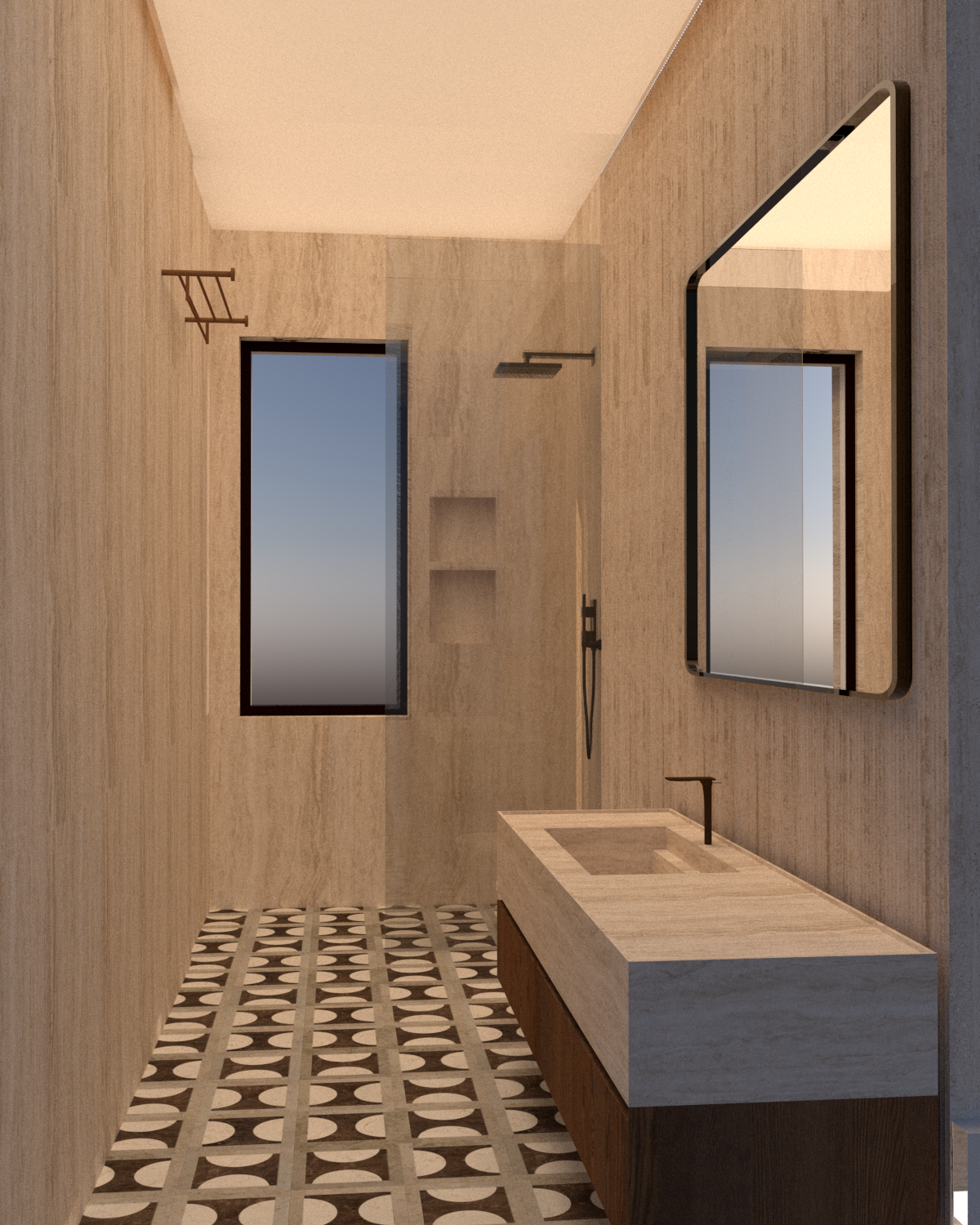 ultra realistic render make it modern marble travertine texture and right reflection of glass led after the mirror and bronze mixer make it timeless make the right light soft
