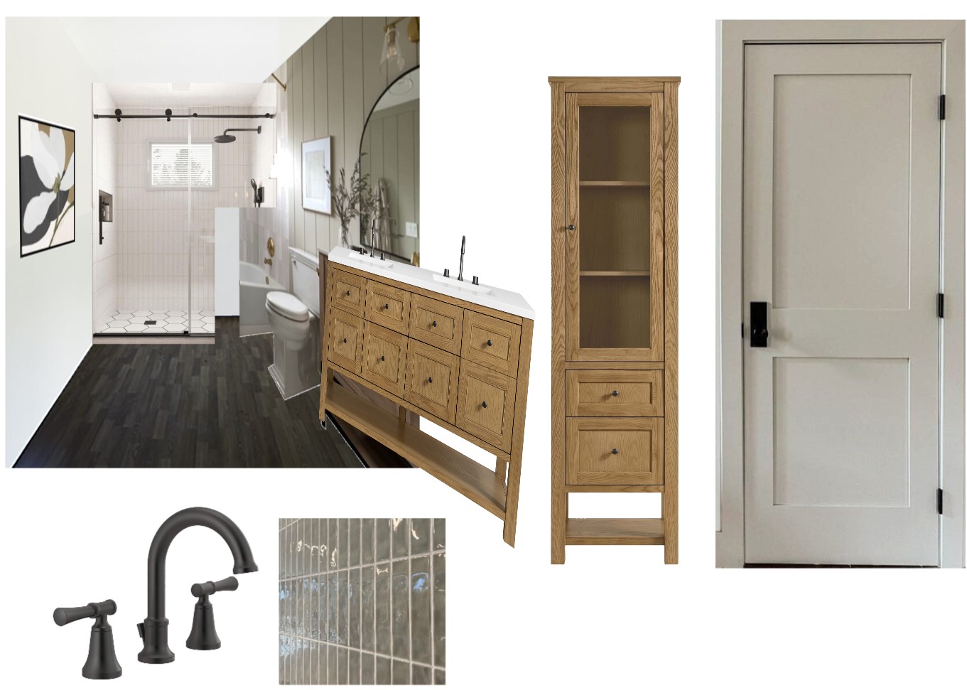 create a 5 wide by 10 long bathroom with a double sink vanity and two black arched mirrors above at the far end of the shower place a shower with a window in the center of the wall use similar vertical subway tiles in the shower use all the coloring and materials provided in the mood board to make a realistic looking bathroom