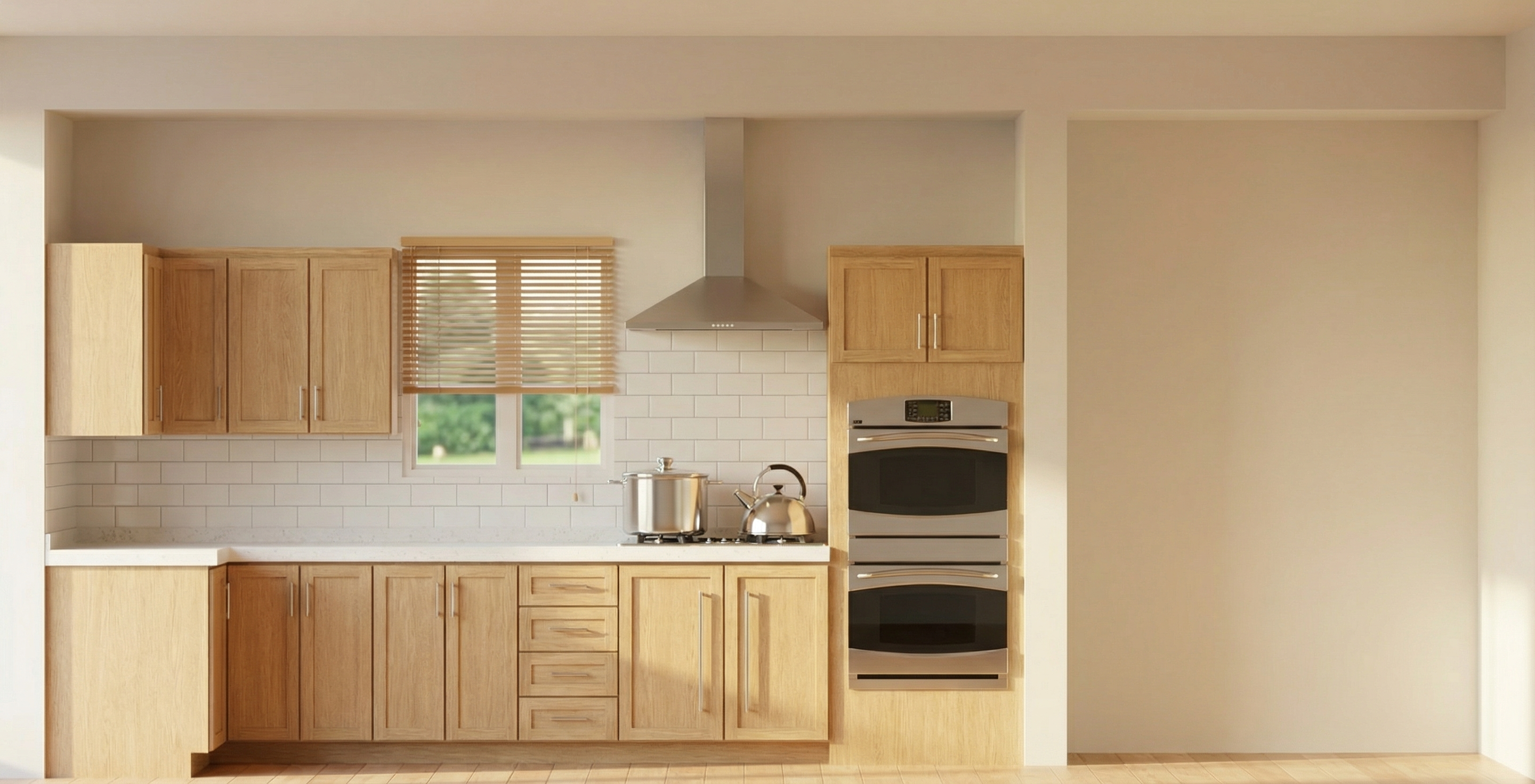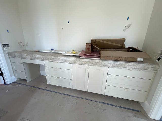 do not change the cabinets in any way preserve the exact cabinet colors materials finishes dimensions door and drawer styles hardware spacing alignment and all geometry exactly as shown do not alter the countertop shape backsplash appliances flooring lighting fixtures or wall structure only remove the construction materials clutter and mess from the scene clean the room and make it look finished and staged add a few simple tasteful home accessories appropriate for the style of the space but do not add or remove any furniture windows or architectural elements maintain the original lighting direction and realism enhance clarity and polish the photo while keeping the cabinetry and room design completely unchanged do not alter the lighting to keep the cabinet colors as they are in the image add tile flooring add gold cabinet pulls to the door and drawer fronts add a large frameless mirror with lighting above stage for a makeup vanity add a stool to the opening