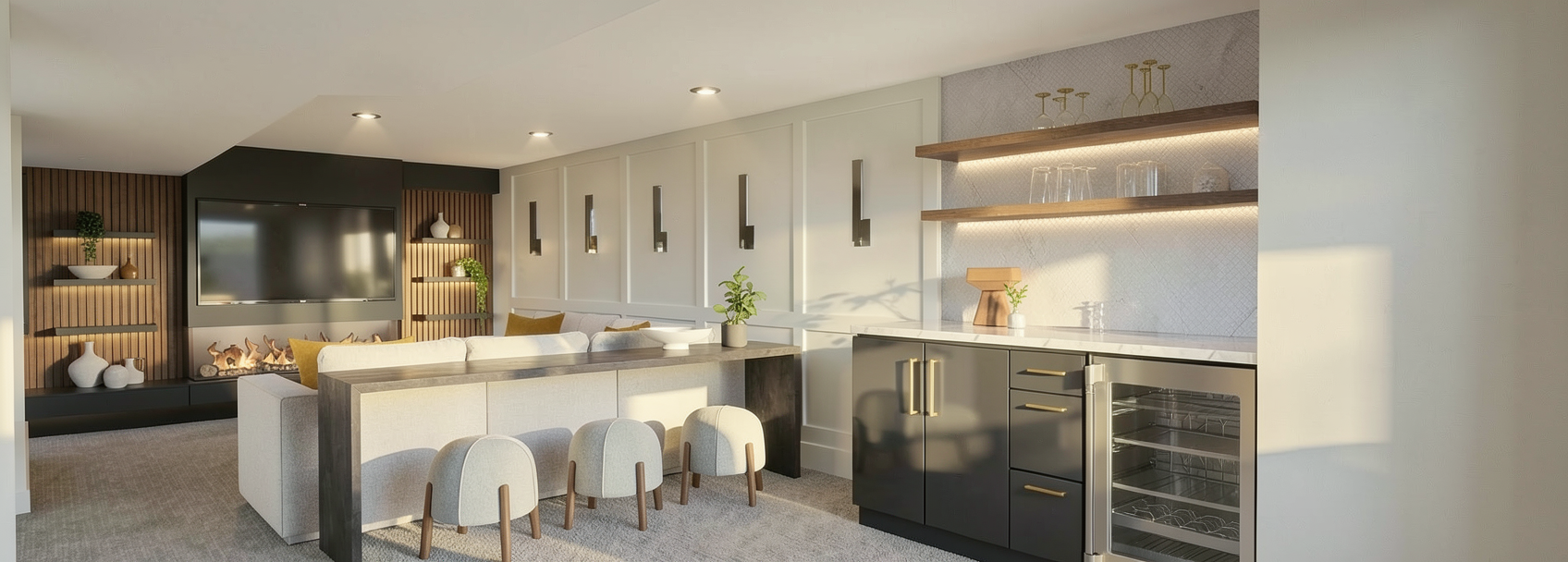 same angle same floor plan but enhance the textures with light oak flooring white furniture light soft ambiance