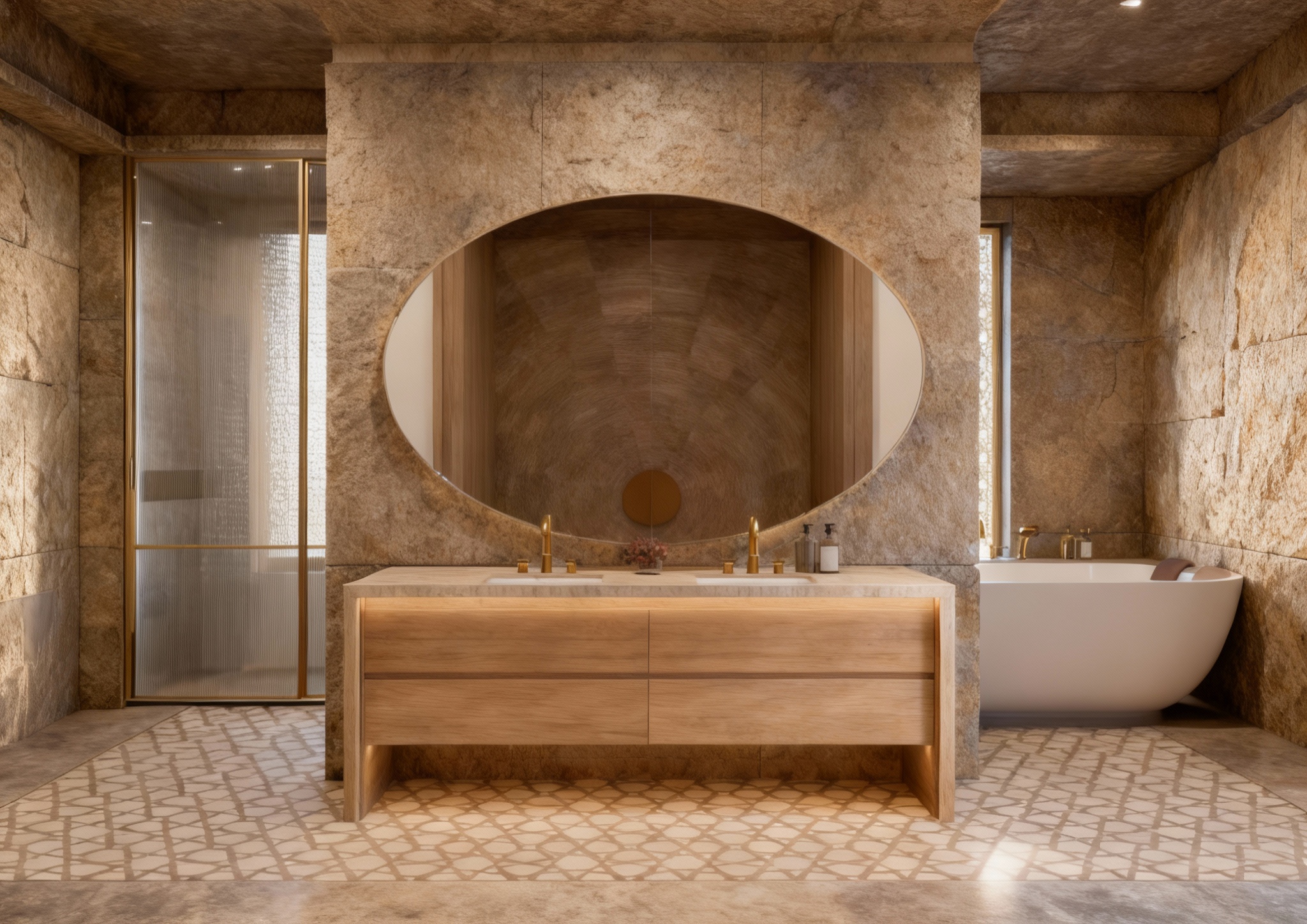 in the center has a smooth wooden arche on top of it the wall is wood on the ceiling the frame is wood