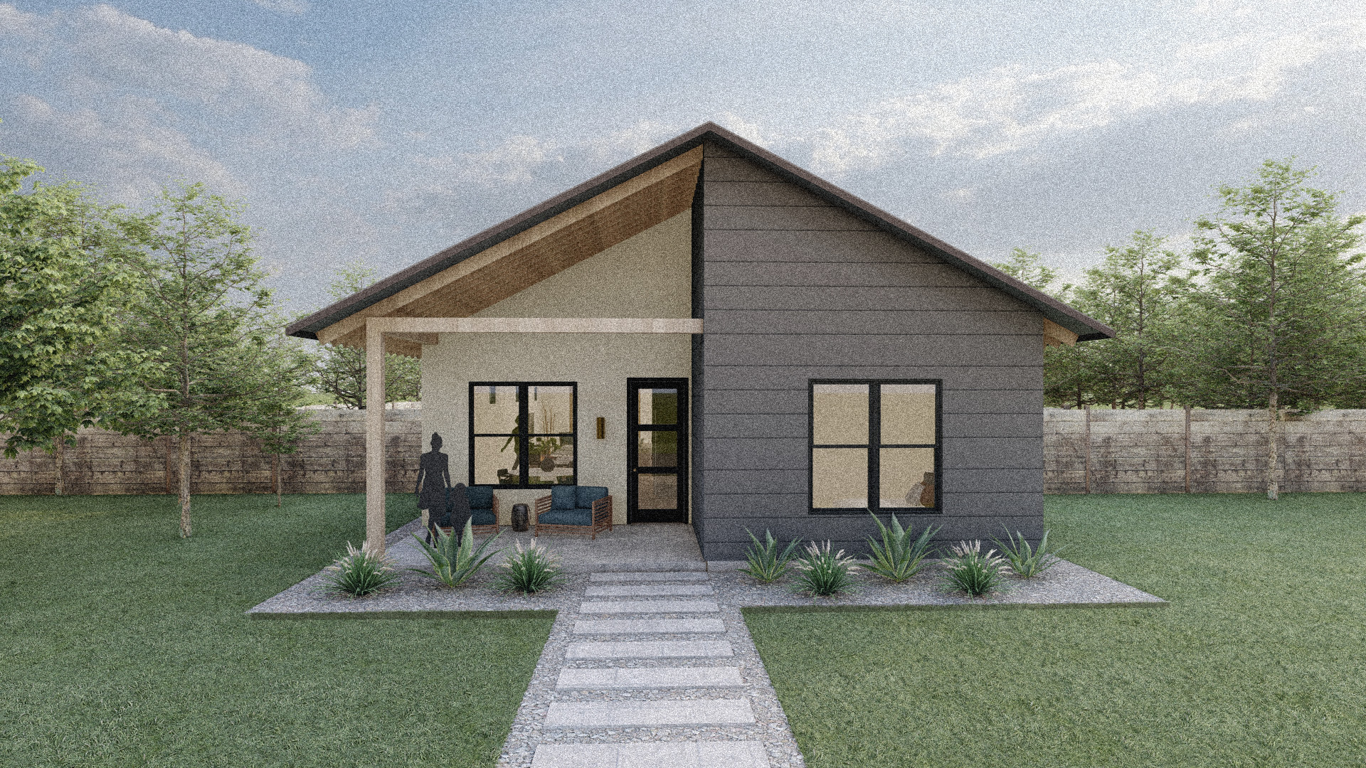 make this more realistic enhance the materials daylight and airy atmosphere with clouds the lights are dimly visible through the windows the environment is central texas with trees and a residential fence