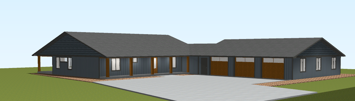 dark blue siding blue shakes in gables black trim wood posts wood garage doors