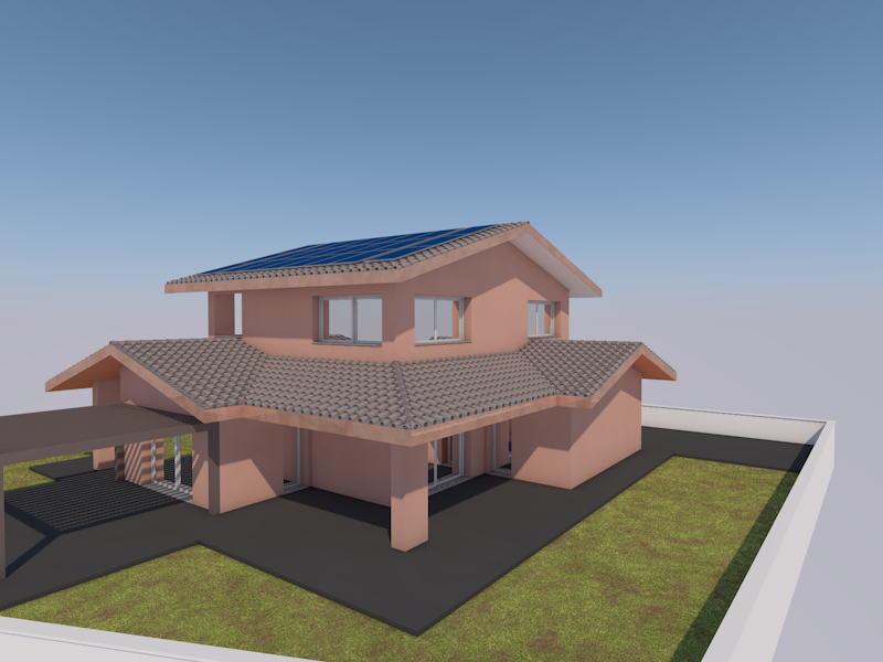 put outside furniture under the cover in the left of the image add real grass and plants don t change any shape make the colour of the window grey brown make the colour of the pavement grey brown tiled make the colour of the facade grey pink make everything minimal and modern but still warm