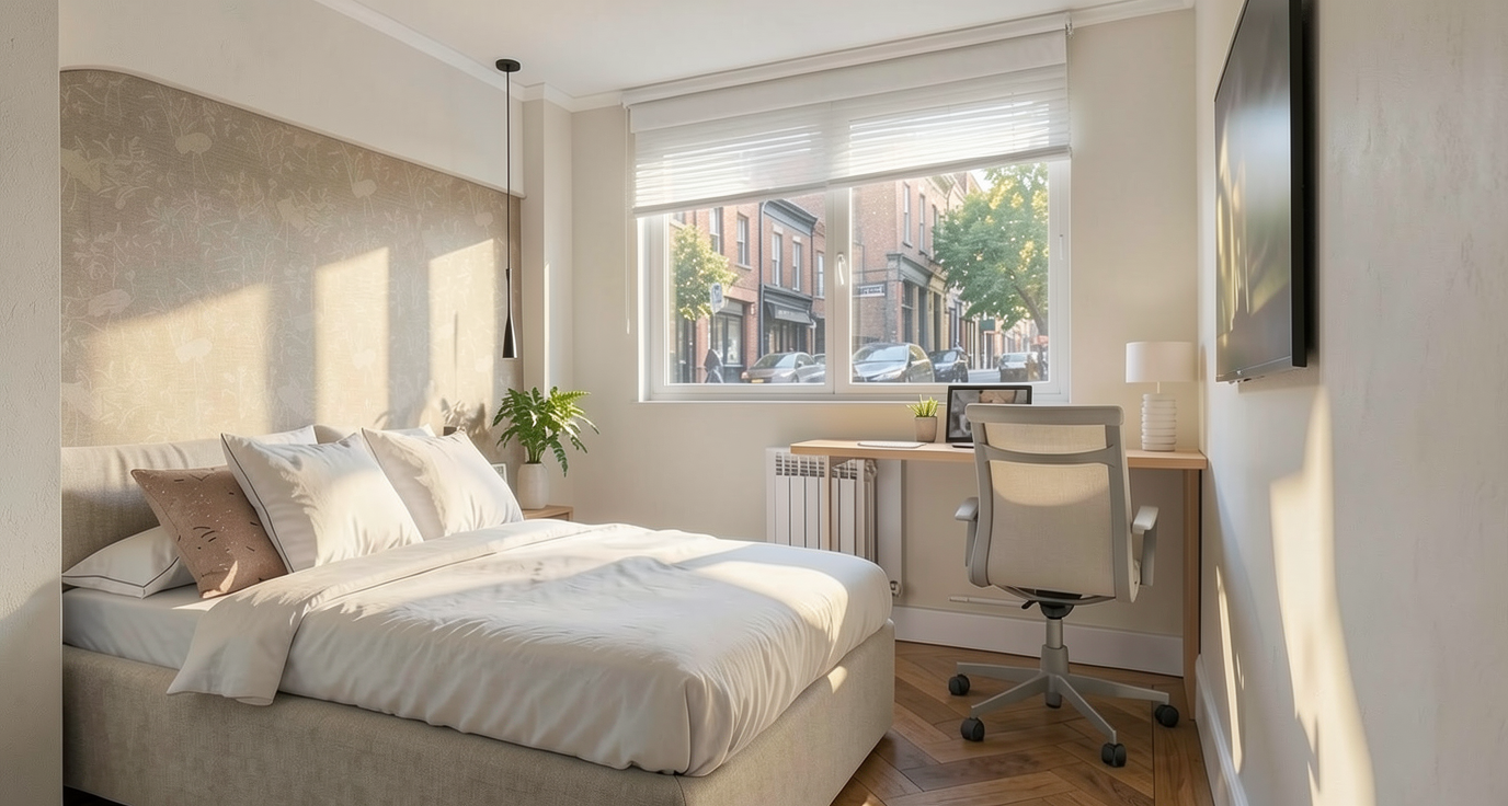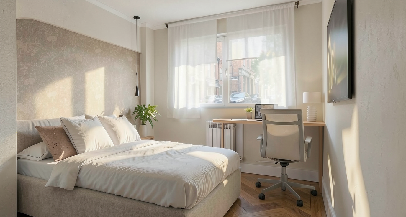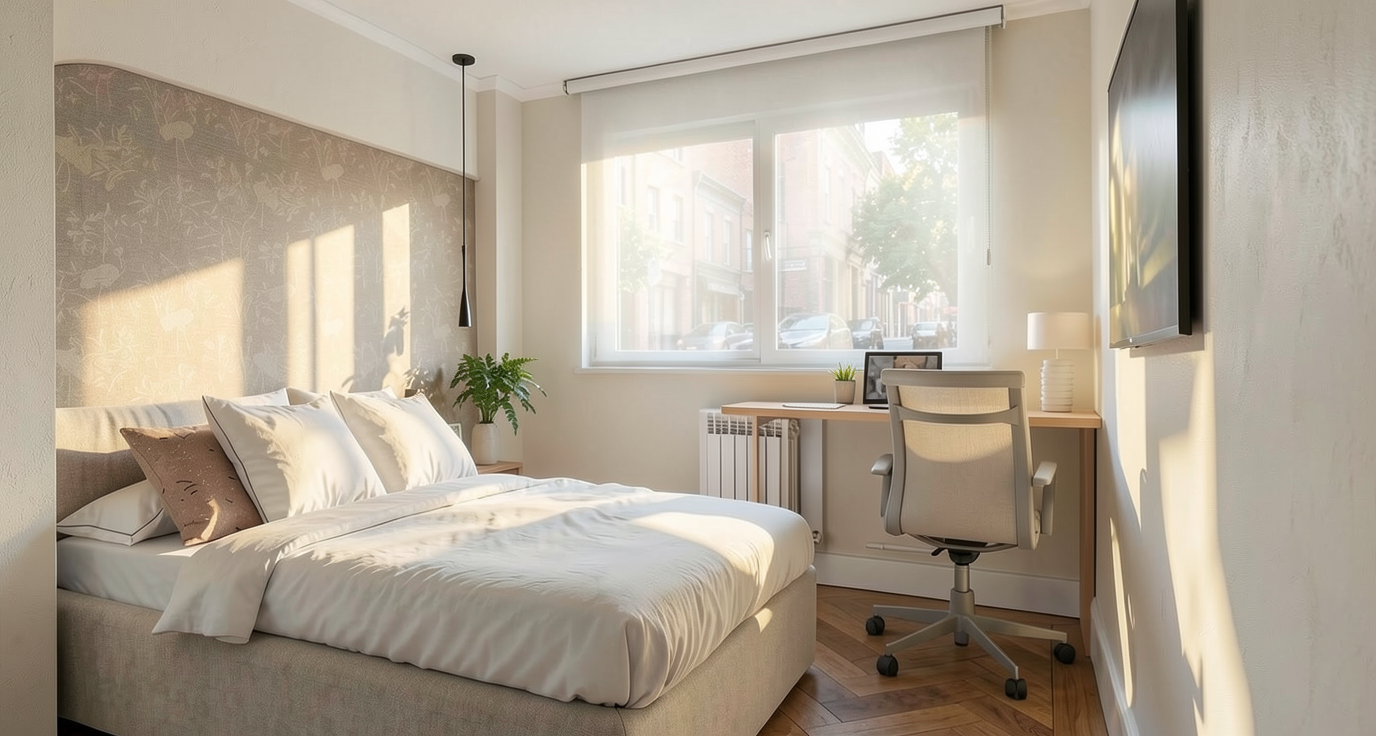 hyperrealistic architectural photography 8k resolution highly detailed textures global illumination raytracing ambient occlusion sharp focus cinematic lighting photorealistic materials uncompressed raw photo slightly dramatic atmosphere 4 stars hotel room interior keep furniture lightning fixtures and vegetation as they are just enhace the look of the materials