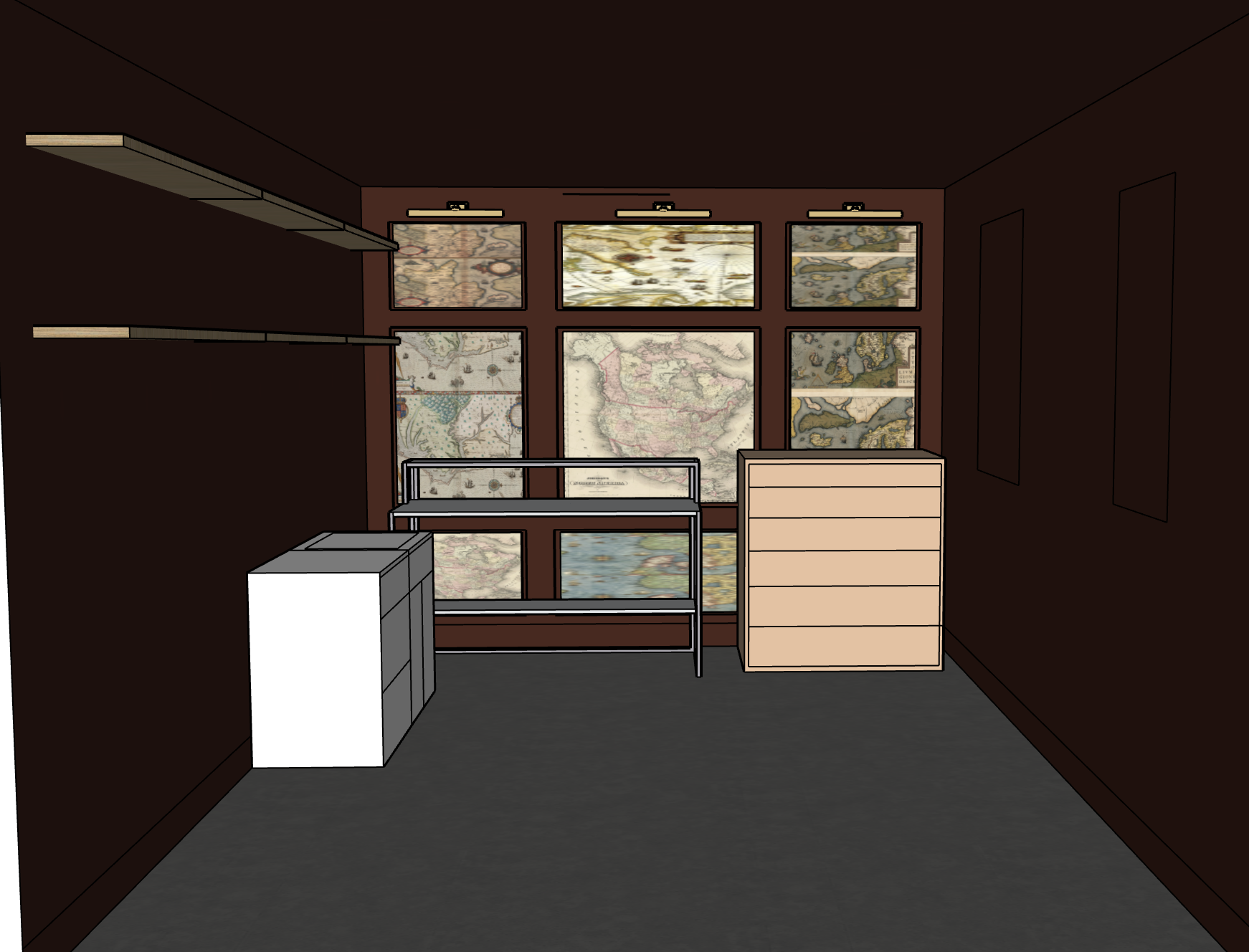 use this exact image as the base model do not change the layout wall positions ceiling height shelving placement furniture placement or camera angle transform the space into a high end private tattoo studio with a dark moody immersive atmosphere walls and ceiling are fully color drenched in a deep blackened burnt orange tone rich black orange matte finish velvety depth no white trim all surfaces continuous and seamless back wall is custom millwork paneling with inset vintage map panels panels are framed in dark stained wood or painted to match the wall color inset artwork consists of aged vintage maps with muted tones sepia faded greens parchment creams slight texture and patina on maps for authenticity integrated picture lights above select panels in warm antique brass lighting low moody warm lighting 2700k soft directional lighting focused on artwork wall subtle ambient glow no harsh overhead lighting add hidden led strip lighting under shelves for a soft wash furniture and materials tattoo workstation feels minimal clean slightly industrial matte black metal dark wood add a refined masculine slightly vintage vibe replace basic dresser with something more elevated dark wood or blackened finish keep overall palette dark tonal and layered shelving floating shelves in dark wood or blackened finish style minimally with curated objects books small sculptures tools floor dark matte concrete or charcoal toned finish slight texture not glossy overall mood intimate dramatic moody slightly editorial feels like a private high end tattoo studio meets vintage study rich contrast layered textures cinematic lighting render in high realism soft shadows warm tones and atmospheric depth