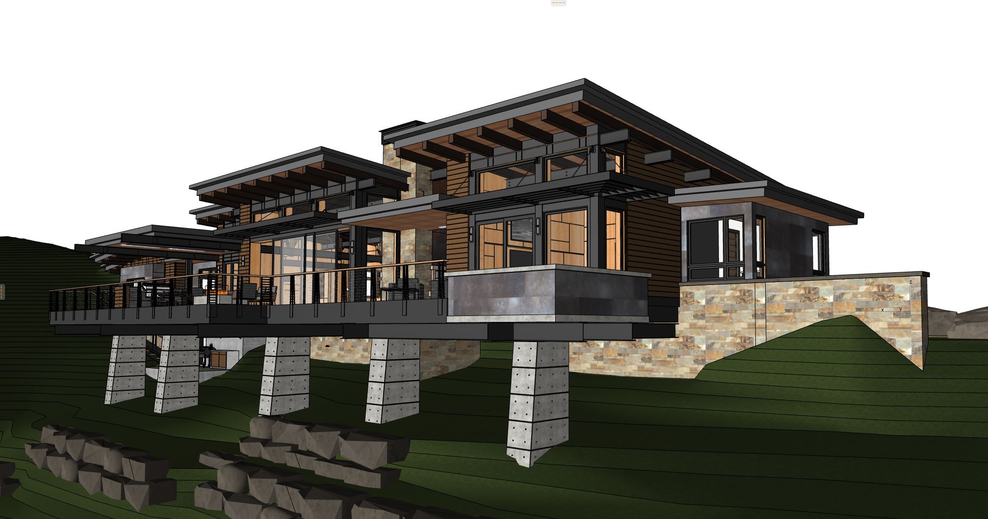 convert this floor plan into a realistic isometric 3d view of a full house show the space from an elevated angle with furniture walls and details visible this time with architectural concrete columns under deck use the same furniture as shows on the plan do not change the orientation of the floorplan