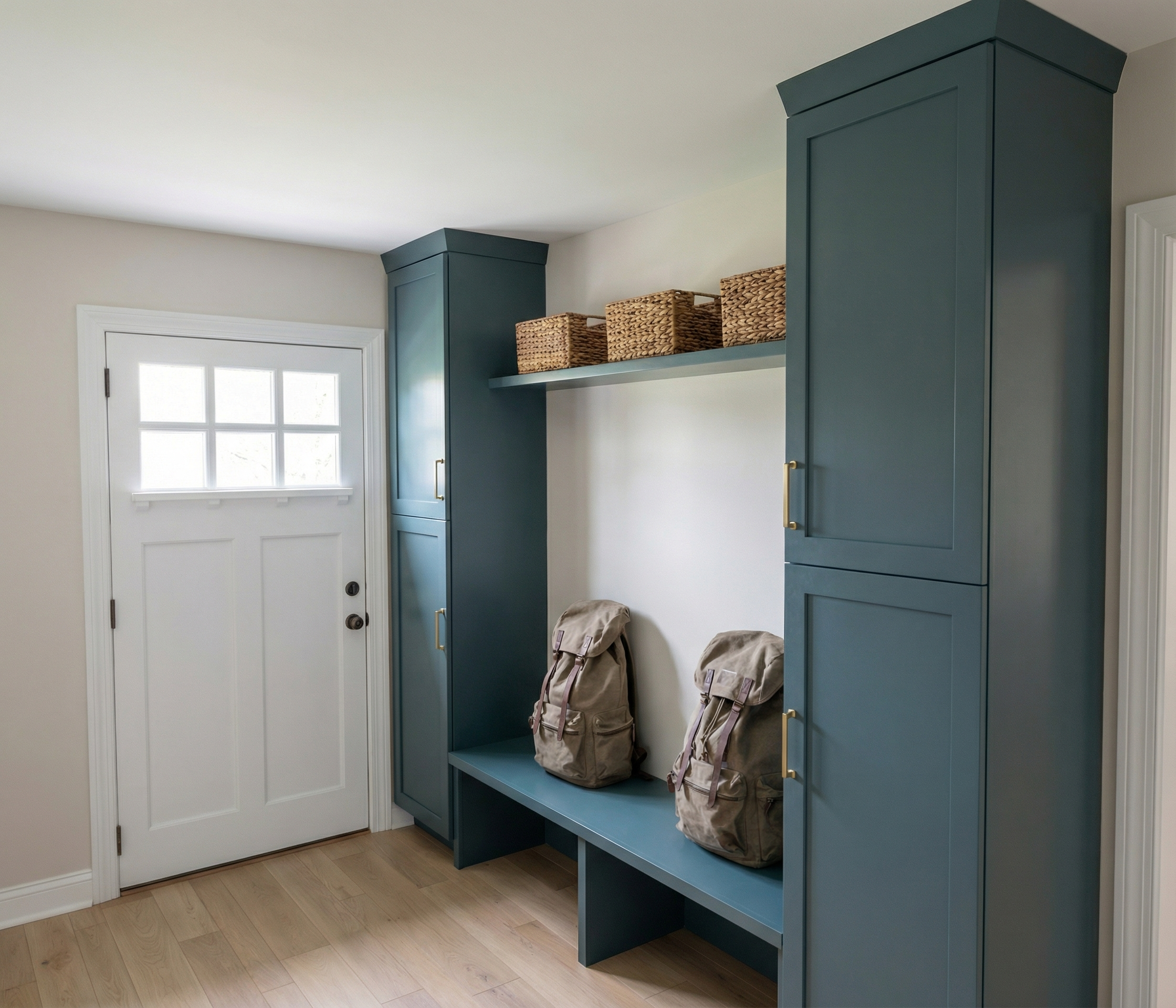 make as photorealistic as possible while keeping textures the same as selection professional landscaping in a lightly wooded scene with good lighting dark grey siding dark roof black white windows solid black front door no furniture on the porch