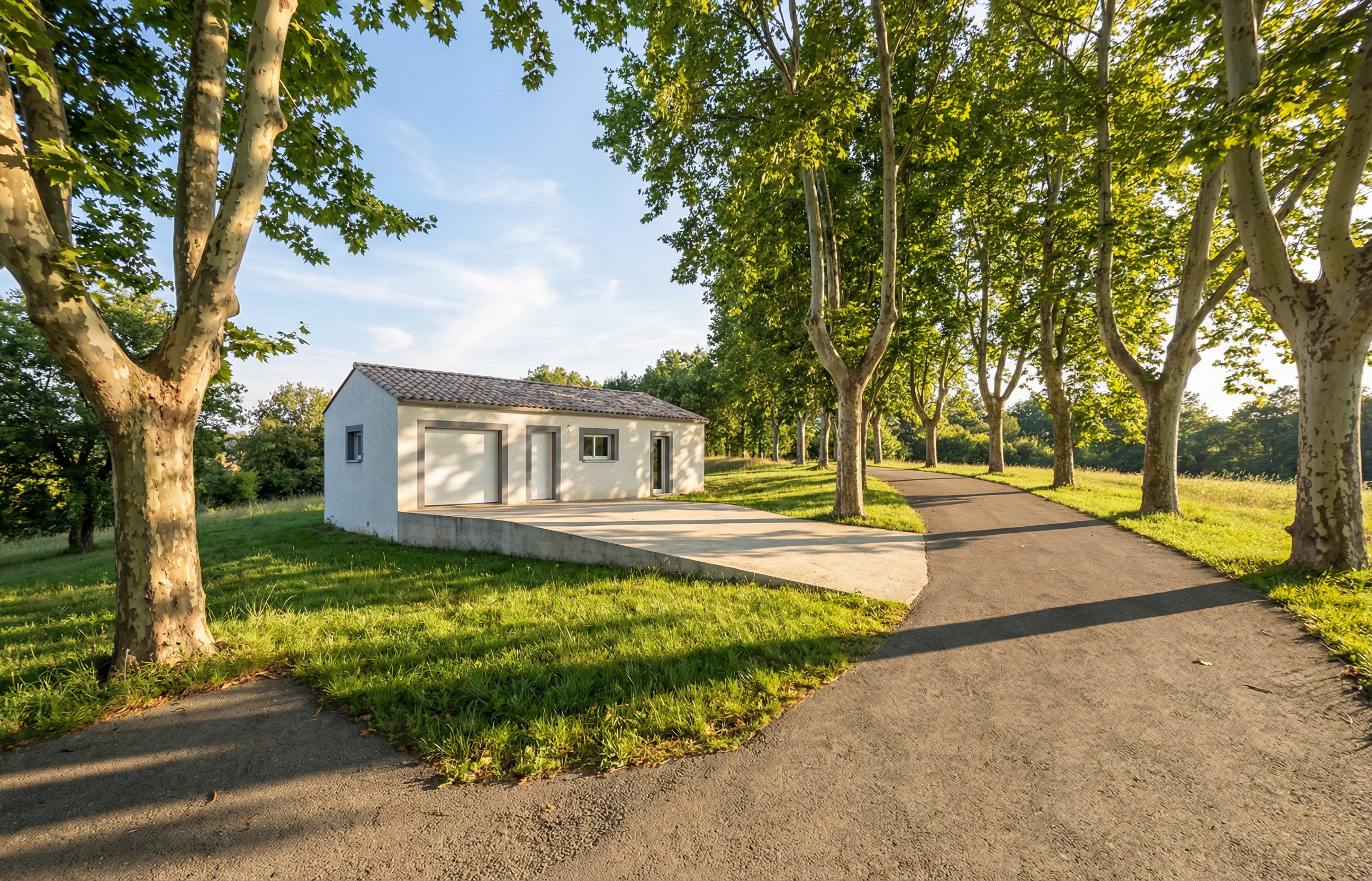 transform the uploaded image into a realistic winter scene while strictly preserving the existing architecture geometry camera angle and composition apply natural snow accumulation on roofs ground ledges and vegetation with believable depth and soft variations add tall conifer trees in the foreground positioned in front of the house so that the architecture is partially and softly obscured by their trunks and branches the trees must feel natural to the scene not blocking the view completely but framing it ensure visible snow on the conifer branches and at their base reinforcing the winter setting lighting atmosphere cold winter daylight diffused sky slightly desaturated palette subtle haze realistic winter shadows and materials reacting naturally to cold and moisture photorealistic result