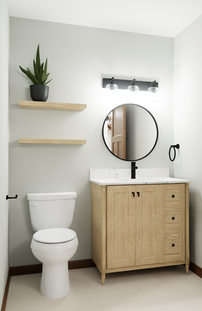 rustic modern boho bathroom beige tile floors with some gray green accents and a white black with specks of brown chunky granite countertop