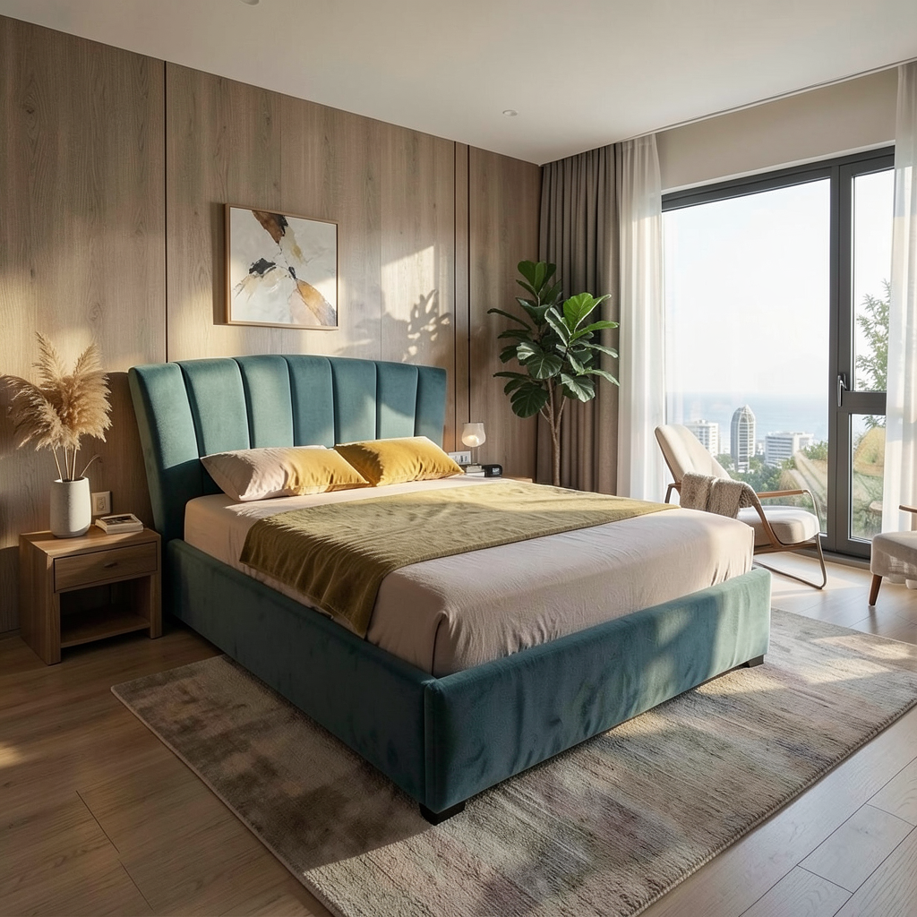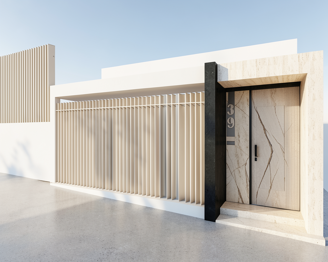 contemporary minimal fa ade with strong linear geometry and a refined material palette the entrance is with travertino and the door has striped lines beige greige intravertino adjacent to the entrance a vertical black metal element acts as a contrasting feature and visual anchor integrated within this surface the house numbers are expressed in a travertine finish appearing as perforated or inlaid elements creating a refined material contrast the boundary is formed by vertical metal slats in a light greige beige tone their rhythmic repetition creates a semi transparent screen that balances privacy and permeability while adding texture and movement to the fa ade the boundary is formed by vertical metal slats in a light greige beige tone modern and fresh