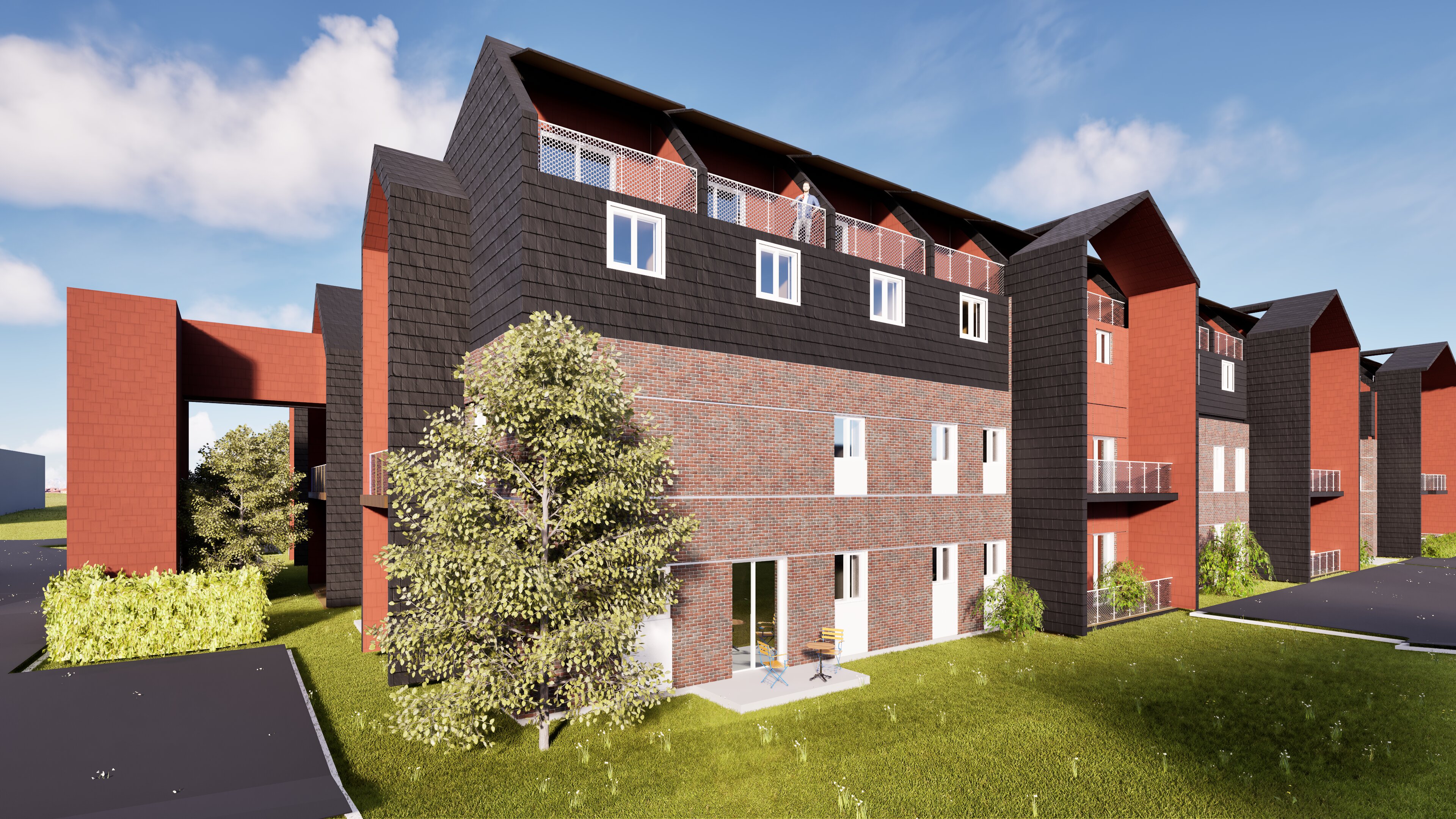 i d like to have the brick less red and a little bit more orange the terracotta tiles are too red too i d like them to be a little bit more brownish and the black metal tiles are not metal ish enough and should be relfectant a bit architecture