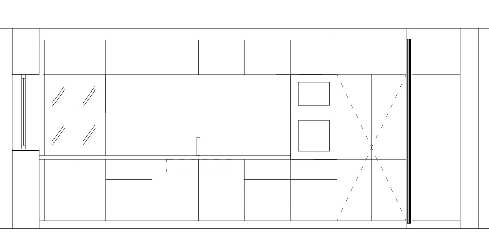 modern kitchen with blue grey units glass display unit left hand side light marble counter top and splash back led lighting in display unit and under top cupboards black shadow line handles black mircowave and oven