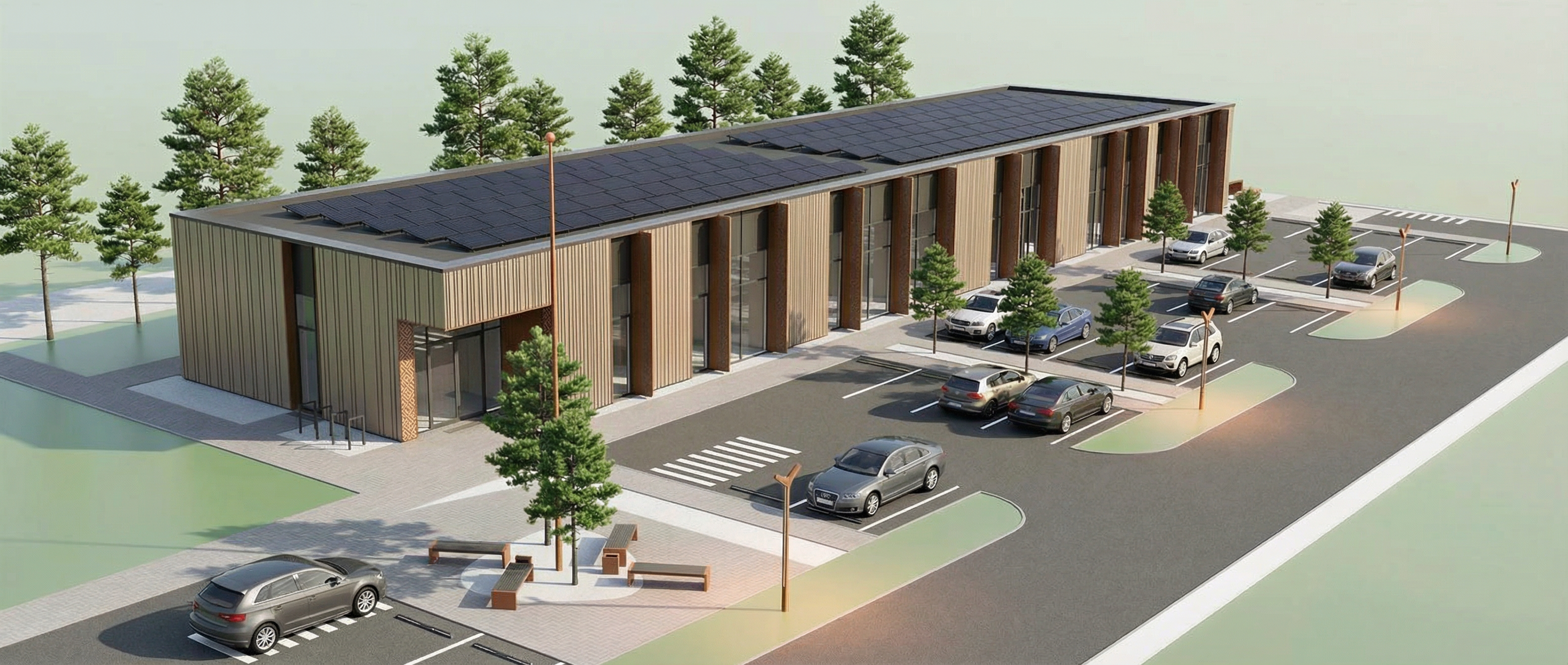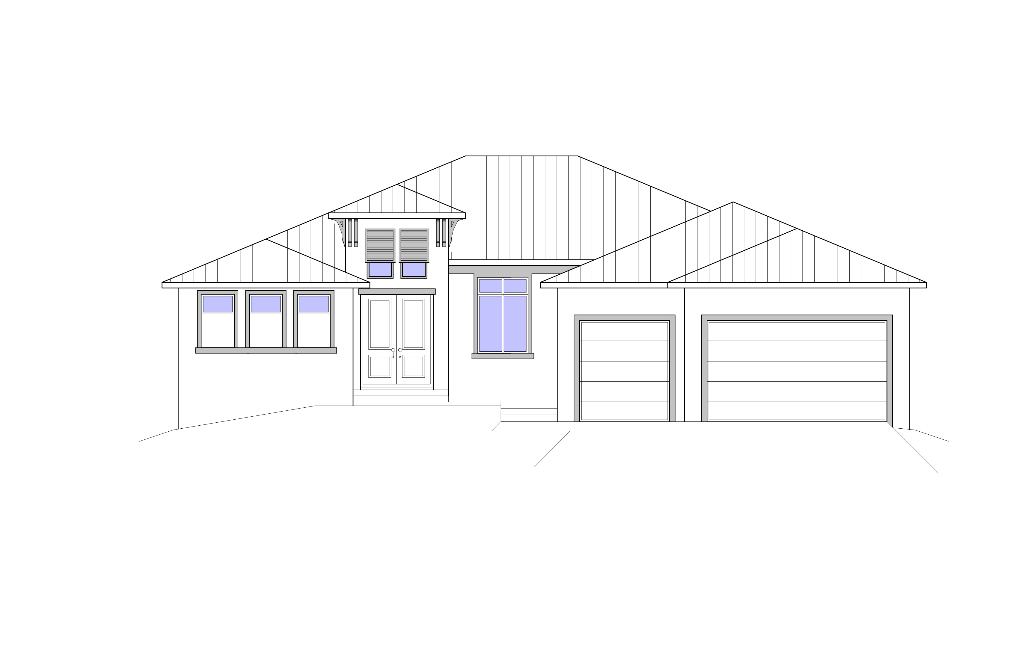 show a light grey standing seam metal roof dark grey corbels dark grey banding around windows and garage doors the short windows on the left side of home have smooth finish white stucco between the bottom of the windows and the 4 banding shown below there are 2 dark grey bahama shutters above the entry windows the entry doors are 2 panels each and painted dark grey the garage doors are light grey the base house is smooth finish stucco painted white dark grey dappled paver sidewalk with 4 steps terraced from entry doors sweeping wide to the garage tropical landscape with blue sky and fair weather clouds elevations strength