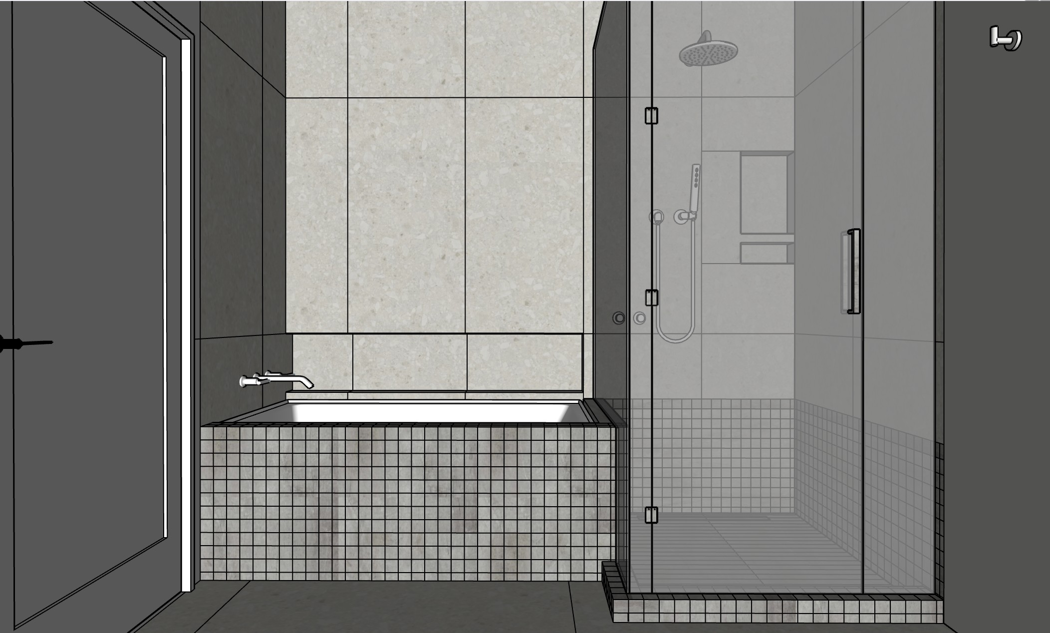 render a modern bathroom with a sophisticated and serene atmosphere use soft gray tiles for the walls and floor enhancing the sense of calm for the bathtub and shower area apply a sleek white finish contrasted with brushed stainless steel fixtures the glass shower door should exhibit a crystal clear transparency reflecting a sense of purity incorporate subtle lighting to create a warm ambiance casting gentle shadows and adding depth to the space